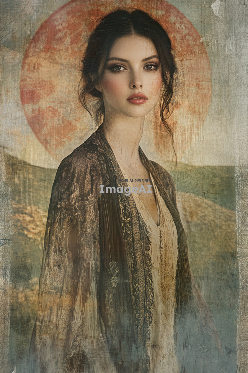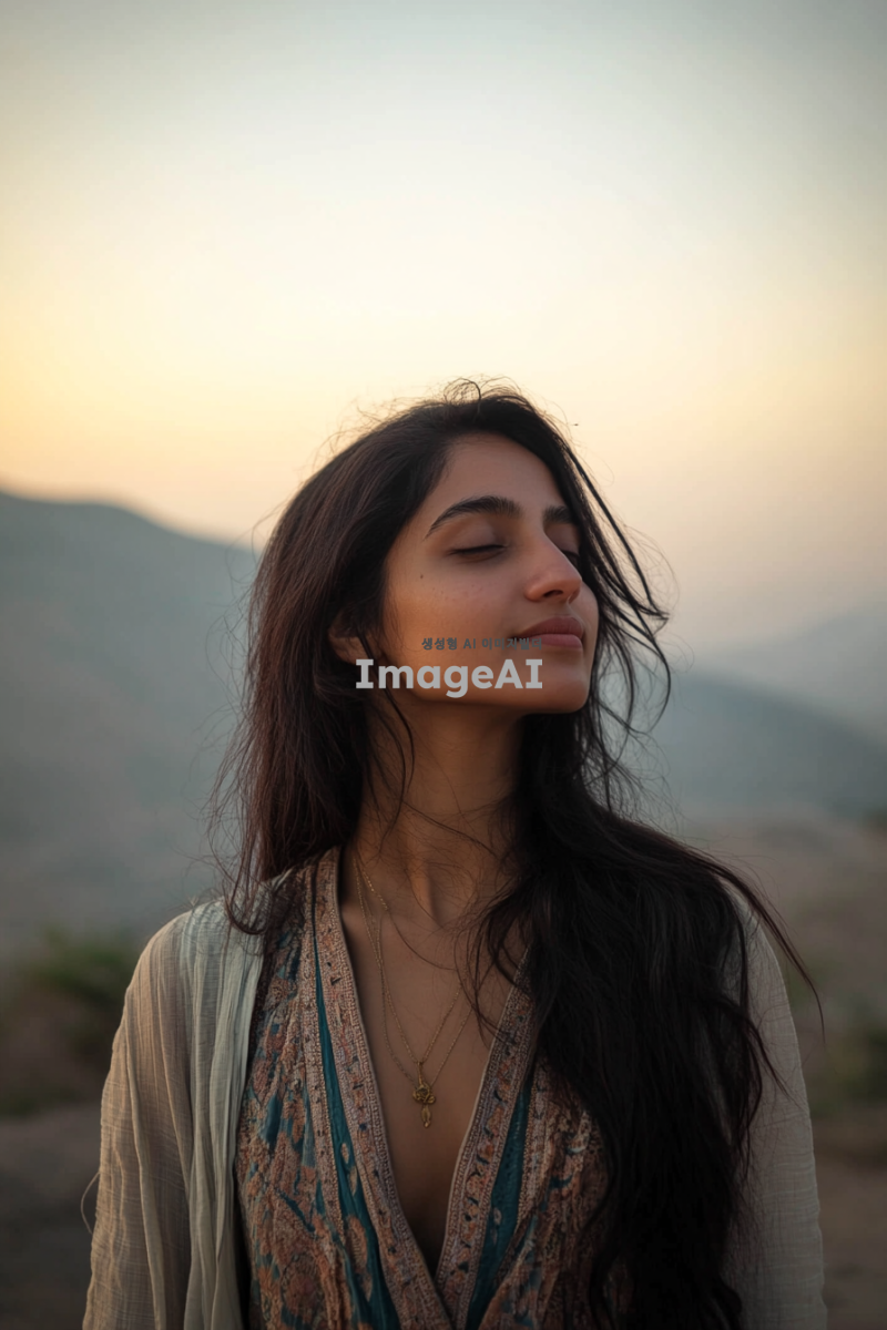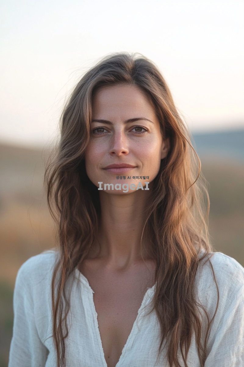 여성의 몸은 정면을 향하고 있으며, 그녀의 눈은 오른쪽을 바라보고 있는 모습. 배경은 부드러운 색조의 자연 풍경으로, 여성은 편안한 표정을 지으며 세련된 의상을 입고 있다. 조명은 따뜻하고 부드럽게 비추어져 있으며, 전체적인 분위기는 평화롭고 조화롭다.