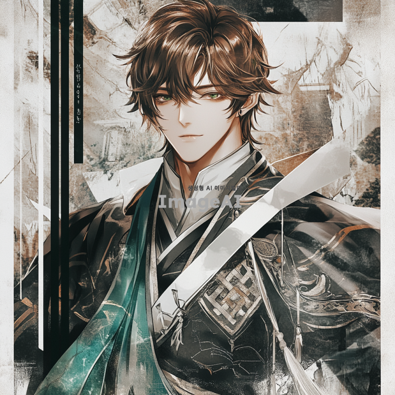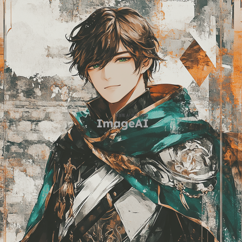 짙은 갈색 머리카락을 가진 한국 남성이 녹색 눈을 가지고 있으며, 장난스러운 눈매를 지닌 모습. 성숙한 매력을 발산하는 캐릭터로, 배경은 자연 풍경으로 설정하여 그의 매력을 강조. 웹툰 스타일의 그림체로 그려주며, 신비로운 문양이 그려진 은색 갑옷을 입고 그 위에 망토를 걸친 모습. 중세 시대의 분위기를 느낄 수 있도록 표현하며, 장난스럽게 웃고 있는 모습으로 입꼬리만 조금 올라가도록.