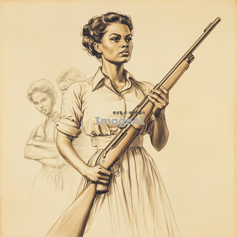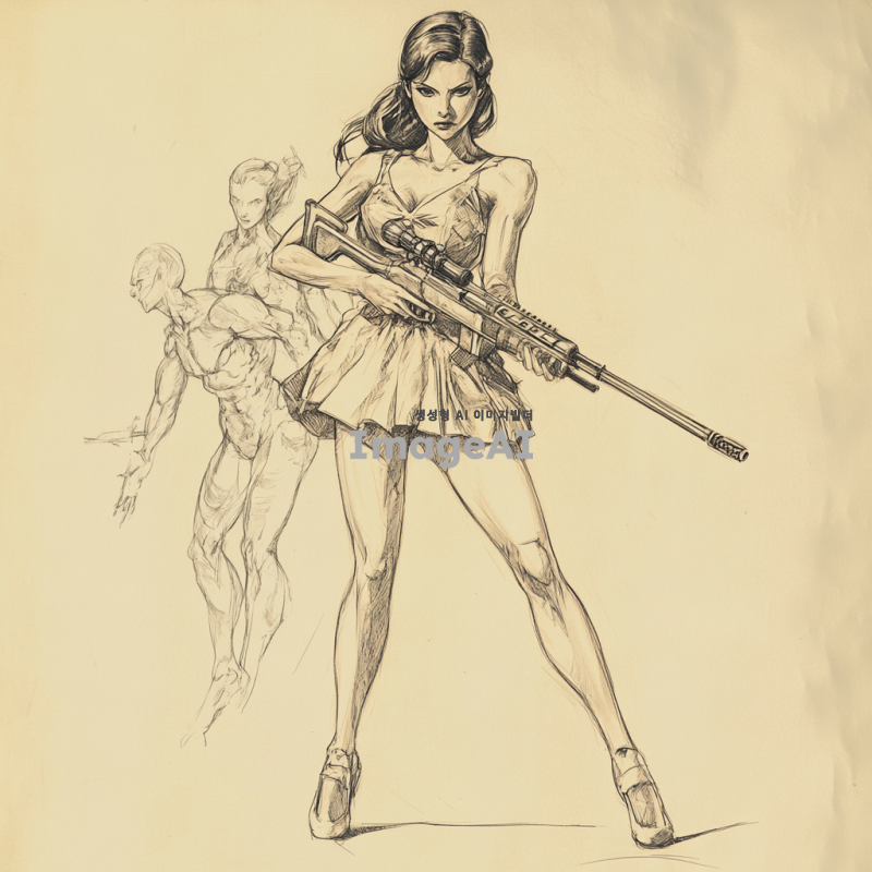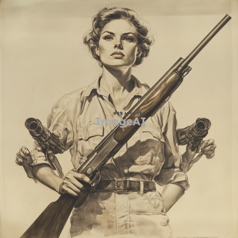 오른손엔 돌격소총을 들고있고 왼쪽팔 3개인 여자를 그려줘
