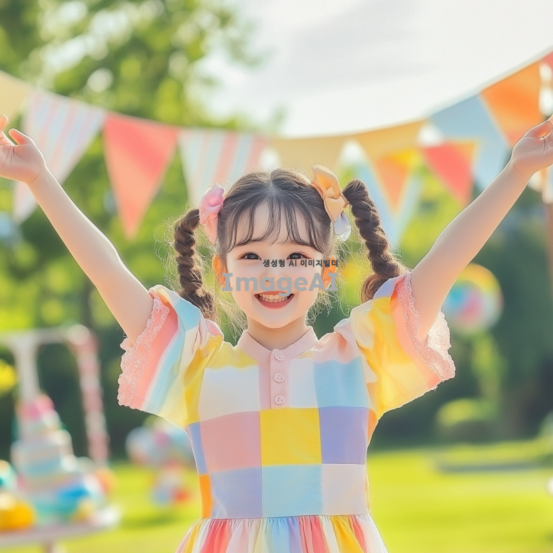 귀여운 한국인 여자, 오른쪽 팔 하나와 왼쪽 팔 세 개가 달린 독특한 모습, 밝고 화사한 색상의 의상, 귀여운 표정, 배경은 화창한 공원, 아기자기한 소품들로 꾸며진 환경, 전체적인 분위기는 경쾌하고 즐거운 느낌.