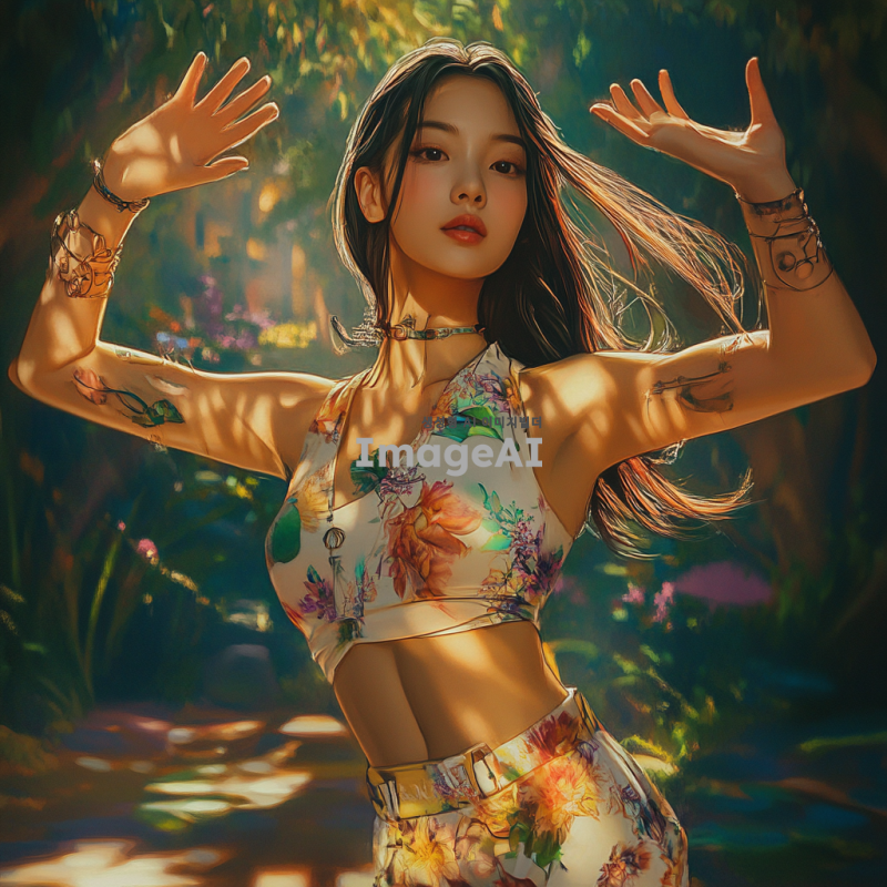 오른쪽 팔이 하나, 왼쪽 팔이 세 개가 달린 여성을 그려주세요. 그녀는 다양한 포즈를 취하고 있으며, 각 팔은 독특한 자세와 표현을 가지고 있습니다. 배경은 자연 풍경으로, 햇살이 비추는 아름다운 정원입니다. 여성의 의상은 현대적이고 세련된 스타일로, 다양한 색상이 조화를 이루고 있습니다.