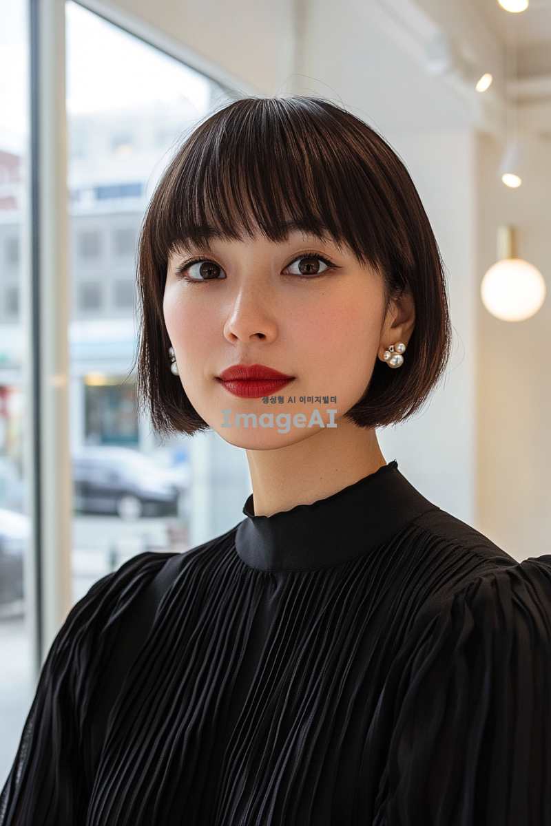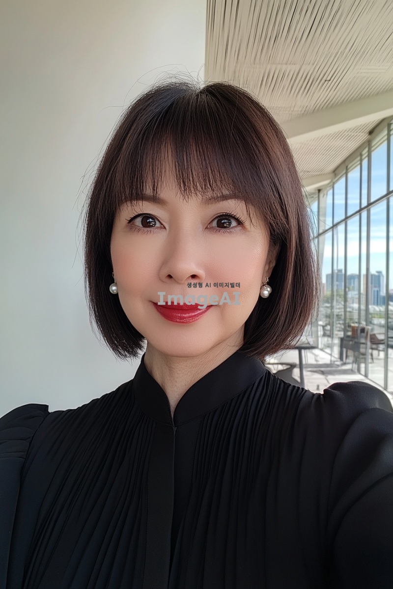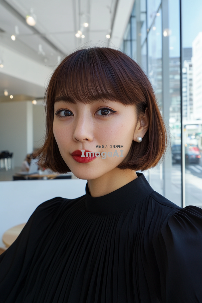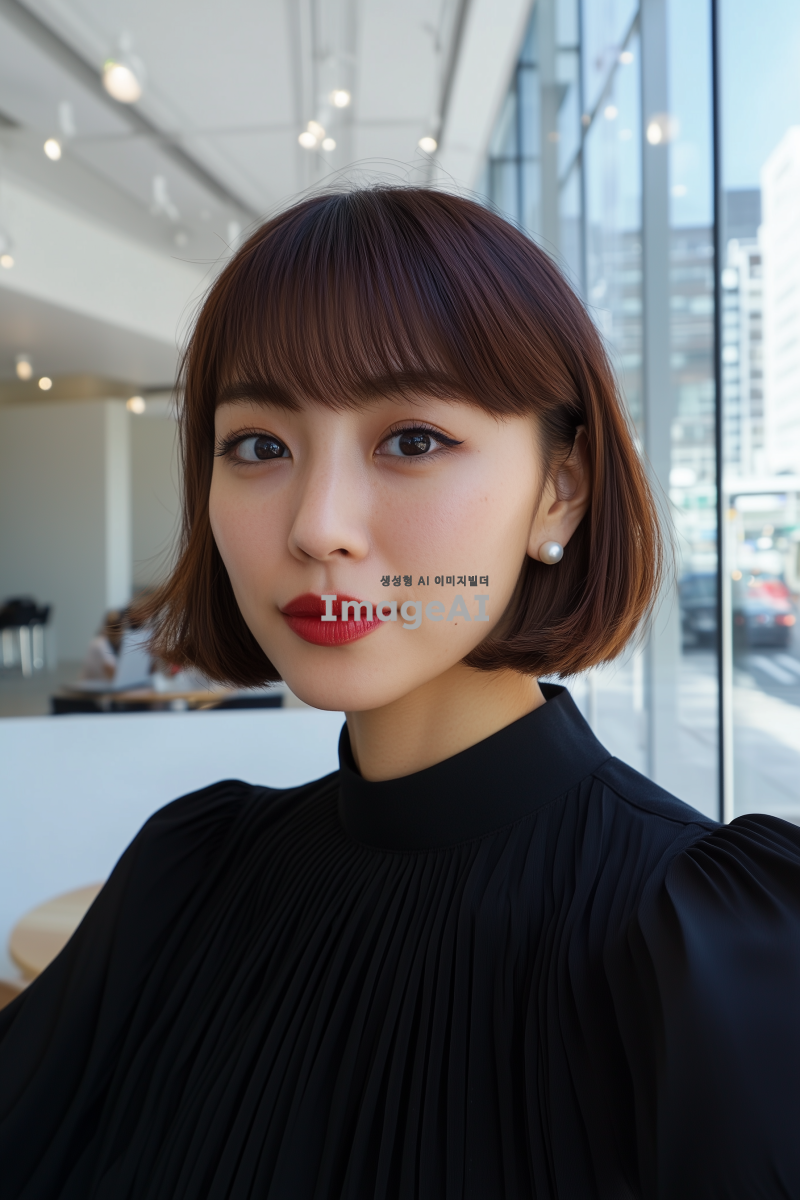 아시아 여성의 짧은 머리로, 검은 블라우스를 입고 진주 귀걸이를 착용한 채로 현대적인 한국 카페 앞에서 찍은 셀카. 그녀는 큰 눈과 밝은 갈색 피부톤, 앞머리가 있는 직선 보브컷, 통통한 입술, 타원형 얼굴형을 가지고 있다. 배경은 흰 벽과 유리 창문으로, 외부 도시 풍경이 보인다.