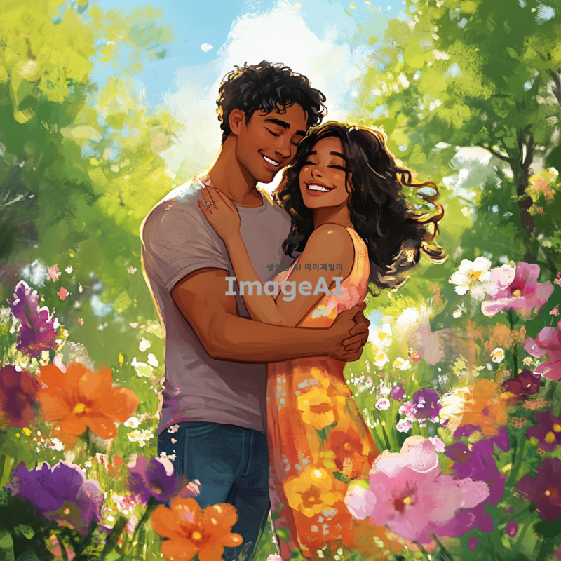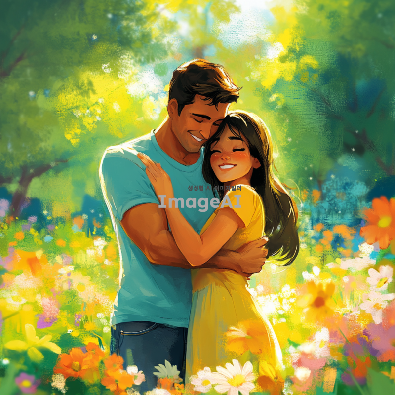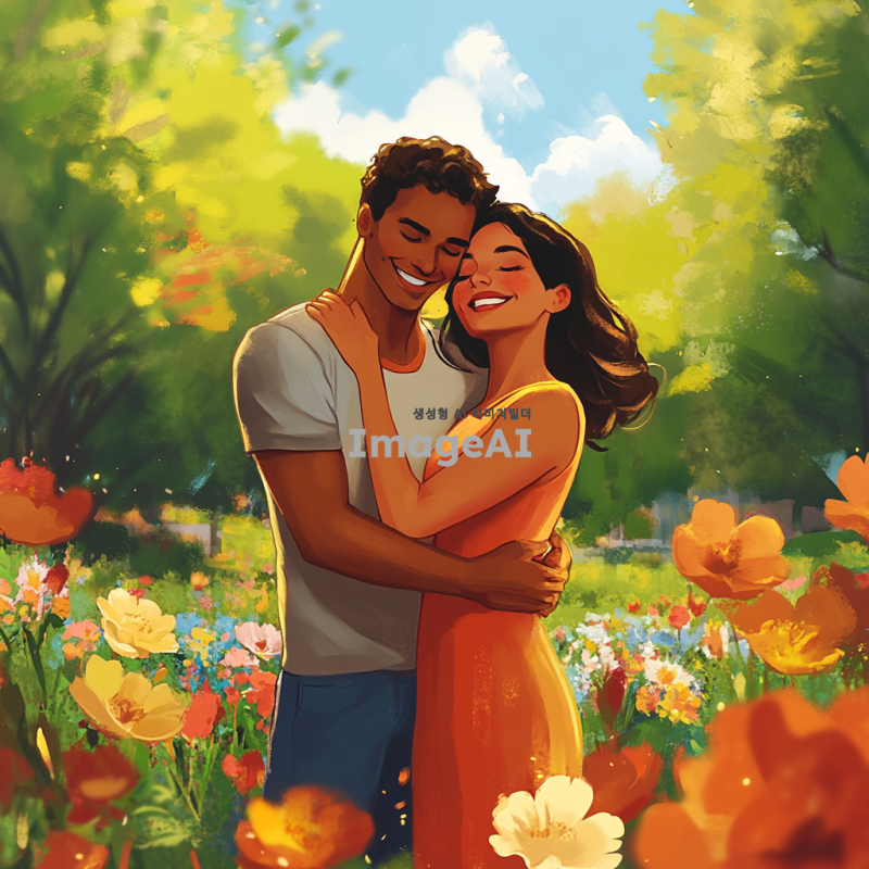 따뜻한 햇살이 비치는 공원에서 남자와 여자가 서로를 안고 있는 장면, 두 사람의 얼굴에는 행복한 미소가 가득하고, 주변에는 꽃들이 만개해 있어 생동감 넘치는 분위기, 남자는 캐주얼한 티셔츠와 청바지를 입고 있고, 여자는 화사한 원피스를 입고 있음. 배경에는 푸른 나무와 푸른 하늘이 펼쳐져 있어 평화로운 느낌을 주는 장면.