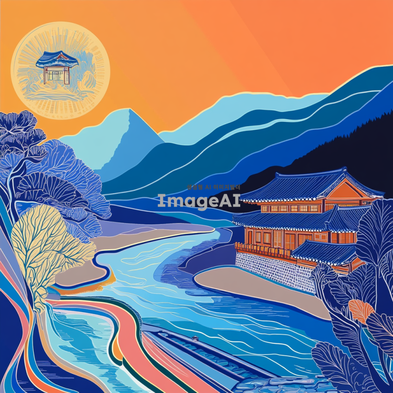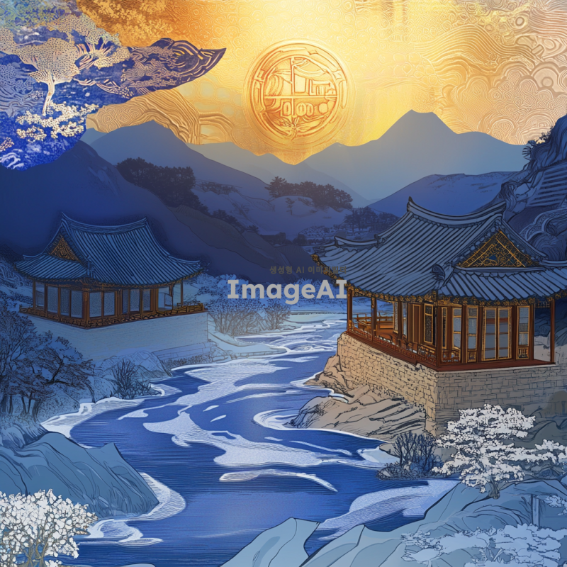 오만원 지폐의 디자인을 배경으로 한 한국의 전통적인 풍경, 푸른 산과 흐르는 강, 그리고 그 옆에 서 있는 한국의 전통 가옥, 따뜻한 햇살이 비치는 모습, 고요하고 평화로운 분위기, 한국의 전통 문화를 느낄 수 있는 요소들을 포함하여 생동감 있게 표현된 이미지.