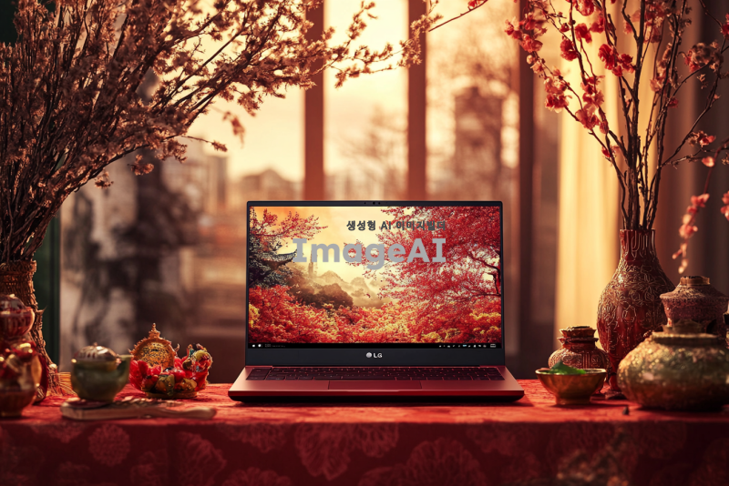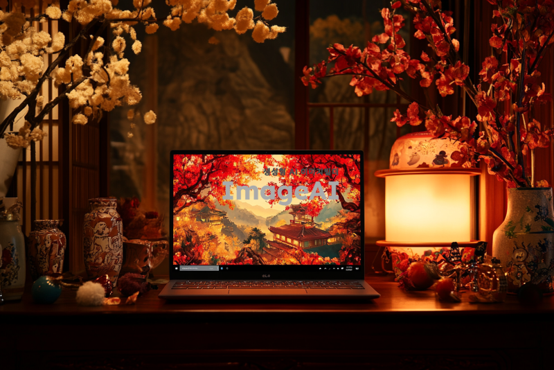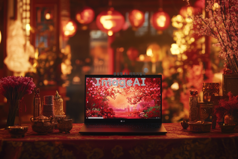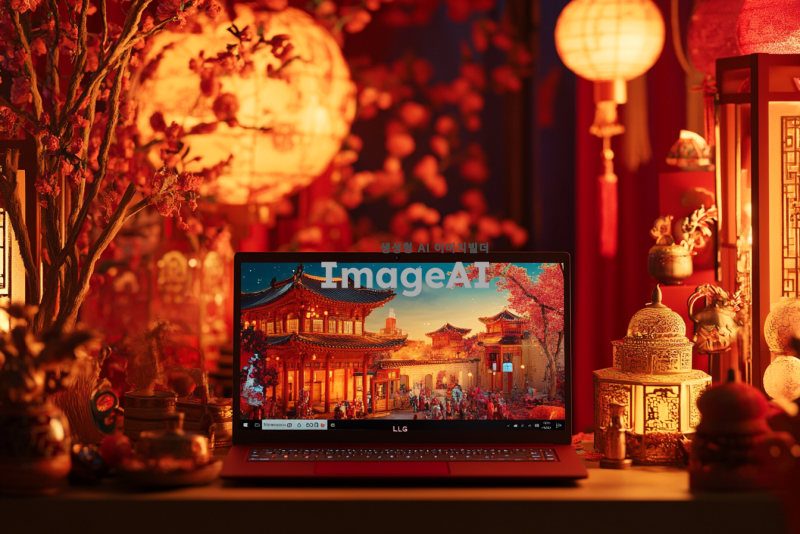 설날 분위기의 배경 앞에 16인치 LG 노트북이 놓여 있는 장면, 따뜻한 조명 아래 전통적인 설날 장식과 함께, 한국의 설날 풍경, 고유의 색감과 디테일이 강조된 이미지, 아기자기한 소품들로 가득한 테이블 위에 노트북이 자리잡고 있는 모습