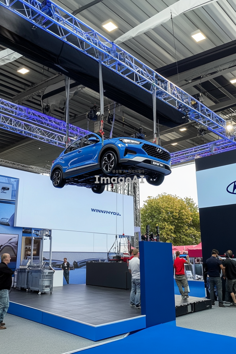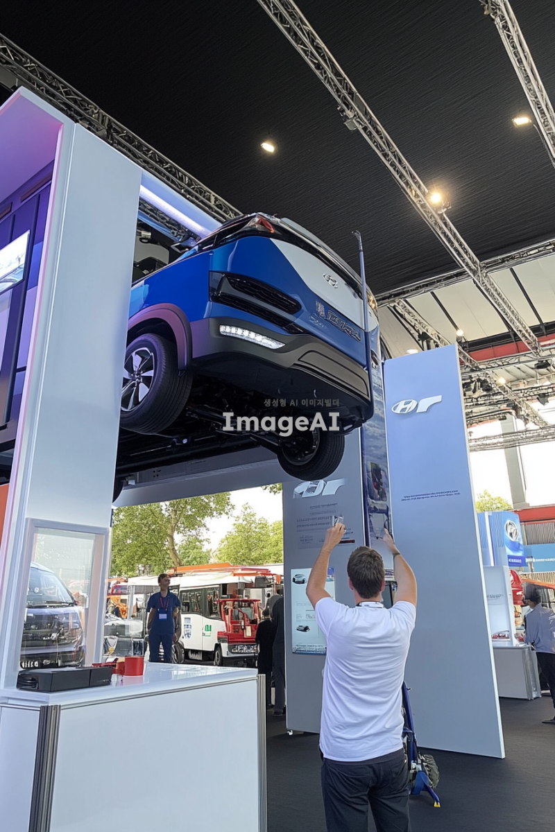 dsv 직원이 모터쇼에서 현대자동차 전시 차량을 부스 위에 포지셔닝하는 모습을 픽사 그림체로 그려줘.