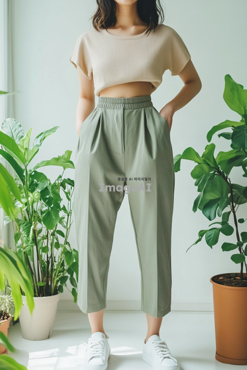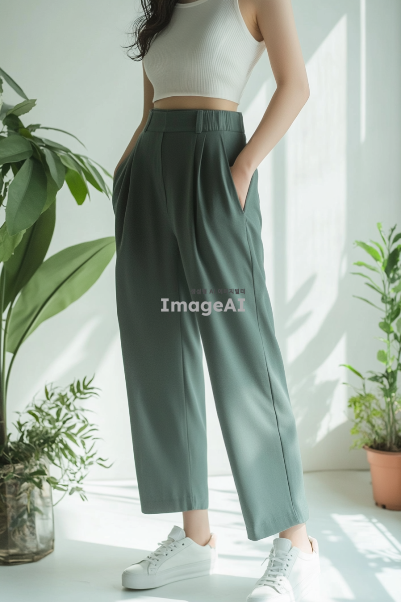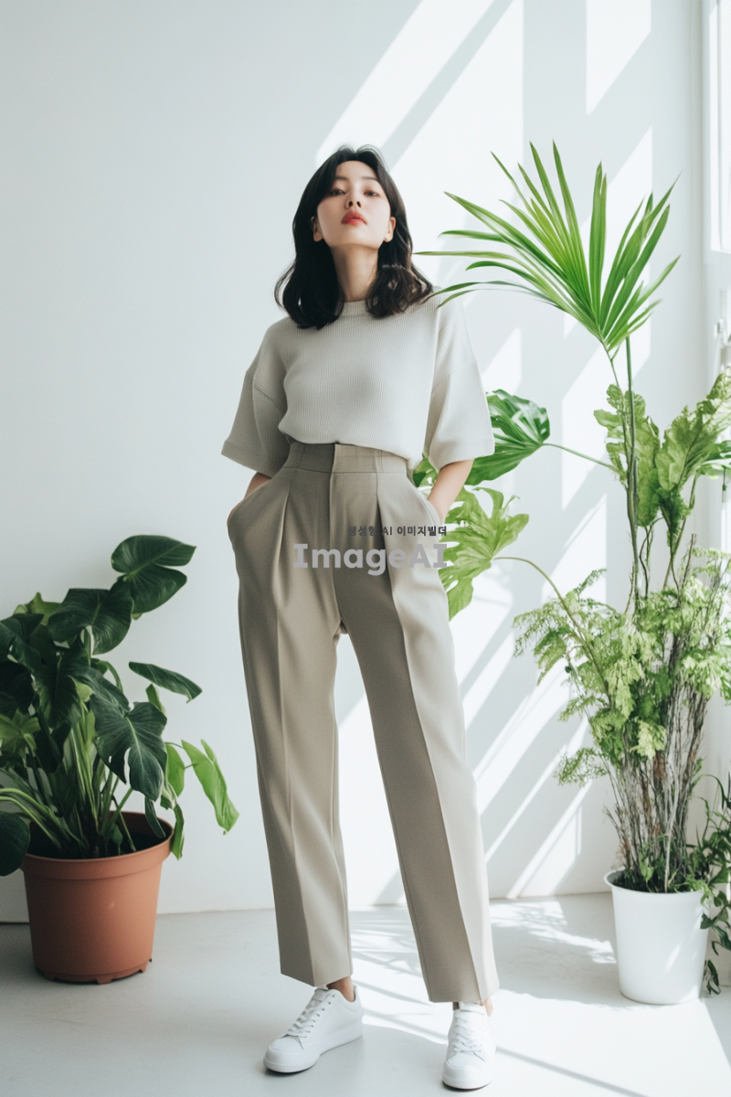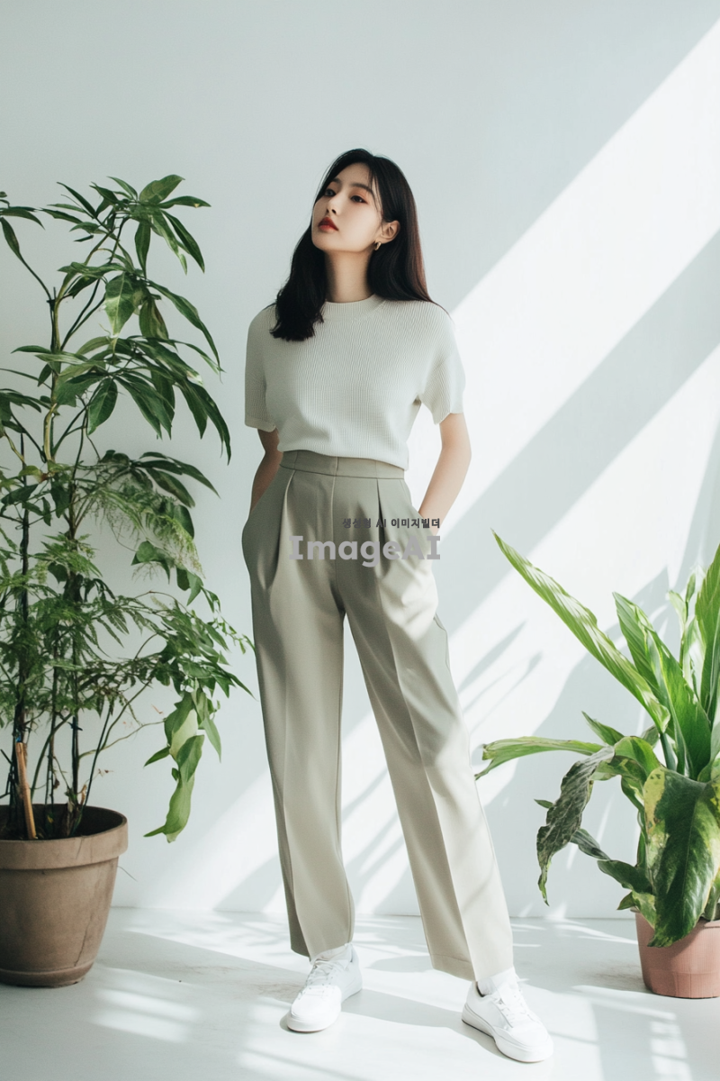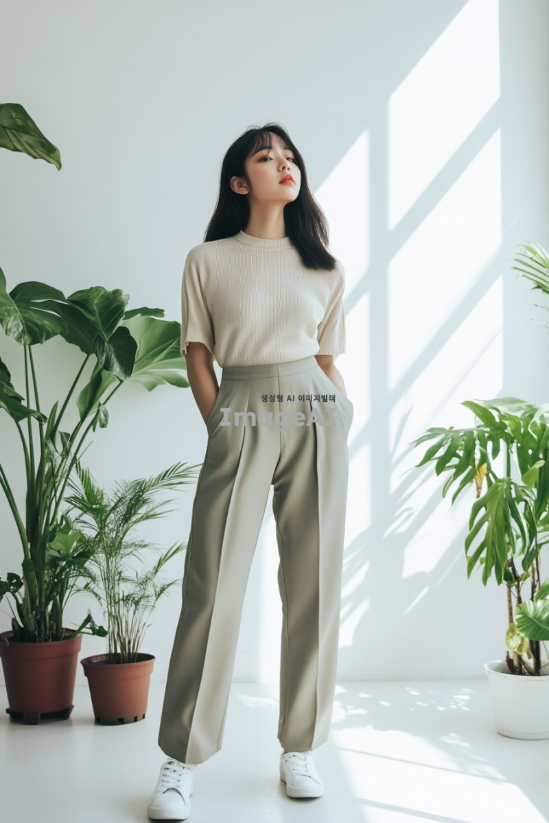 밴딩슬랙스를 입고 있는 한국인 여성, 얼굴은 보이지 않고 사진이 상체에서 잘린 모습, 배경은 화이트에 식물이 있는 실내, 식물 하나와 큰 액자 하나 말곤 어떤 소품도 없는 흰색 벽 배경, 개주얼한 스타일의 상의를 입고 있으며 흰색 운동화를 신고 있음.
