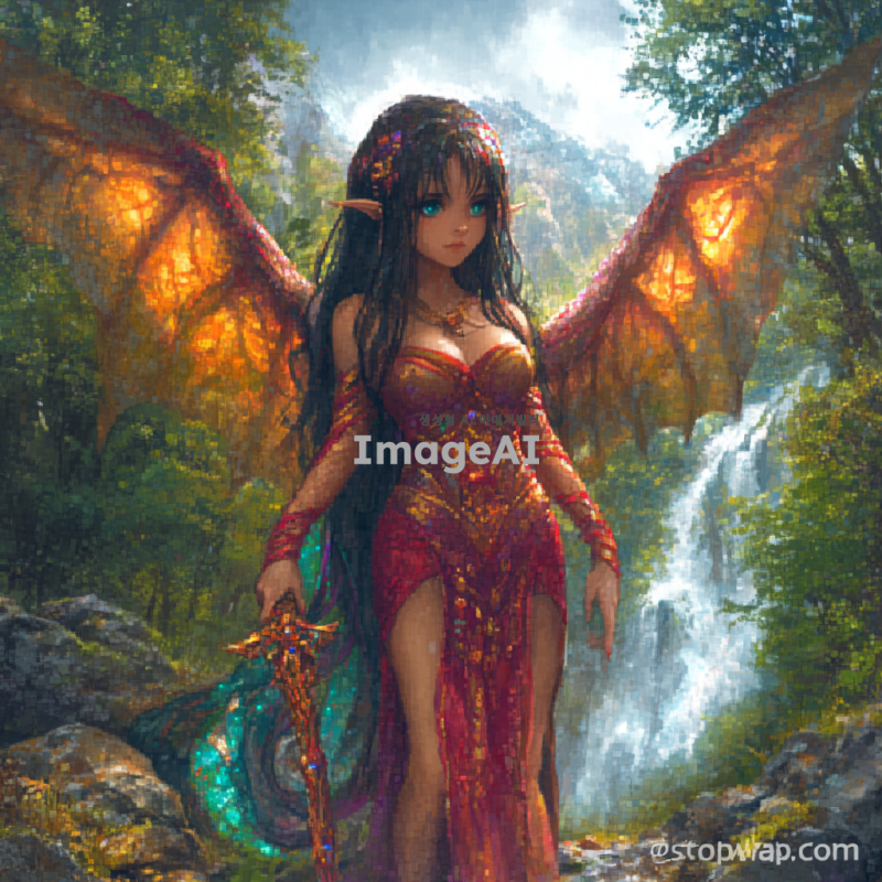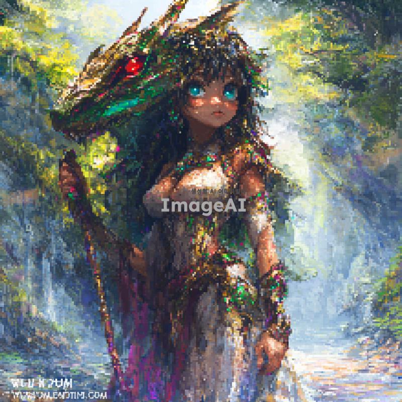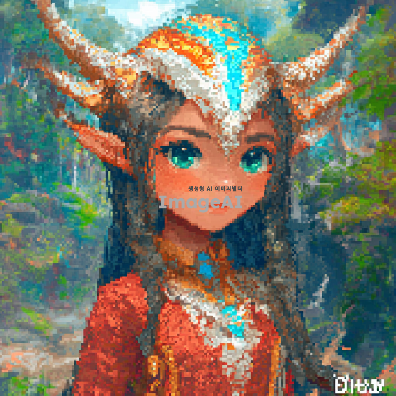 도트 스타일의 여성 캐릭터가 서양식 드래곤으로 변신하는 장면. 드래곤의 인간 형태는 매력적이고 우아하며, 드래곤 형태는 강력하고 화려한 비늘로 덮여 있다. 배경은 환상적인 숲이나 산맥으로 설정하여 신비로운 분위기를 강조하고, 캐릭터의 표정은 자신감 넘치고 강렬한 느낌을 준다.