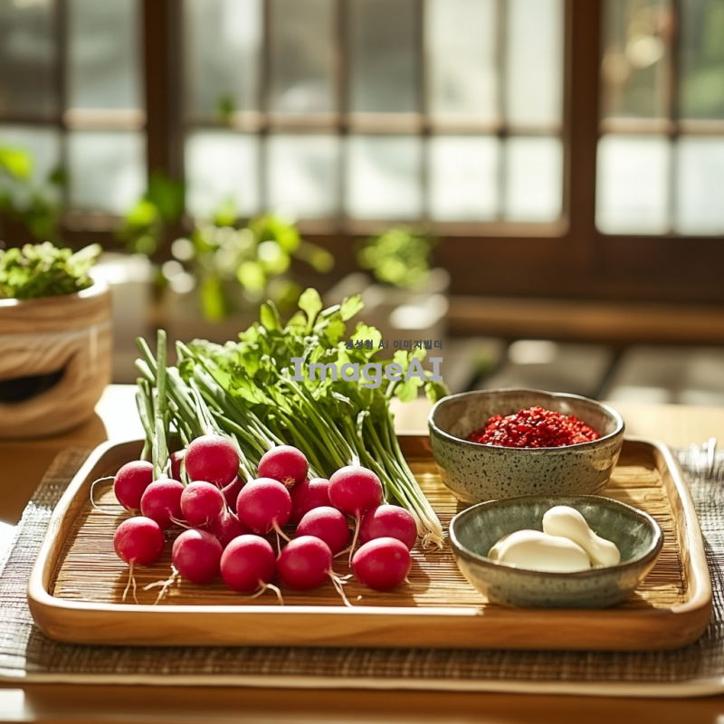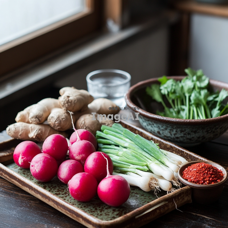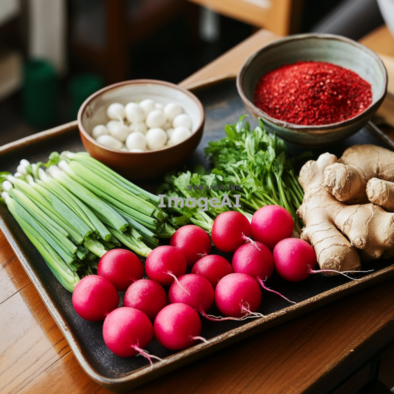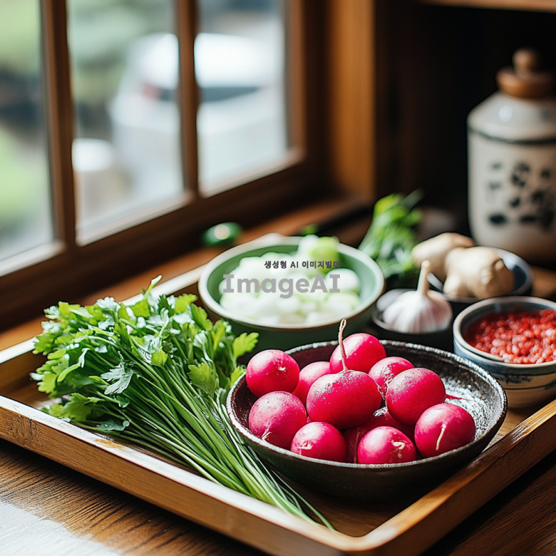 쟁반 위에 통통한 무와 함께 동치미 재료들이 정갈하게 배열되어 있는 장면, 신선한 무, 고춧가루, 마늘, 생강, 대파, 그리고 물이 담긴 그릇이 함께 놓여 있는 모습, 자연광이 비치는 주방 배경, 아기자기한 느낌의 조리 공간, 한국 전통 요리의 따뜻한 분위기