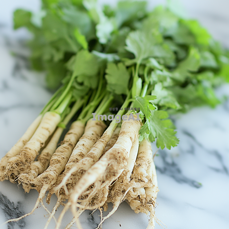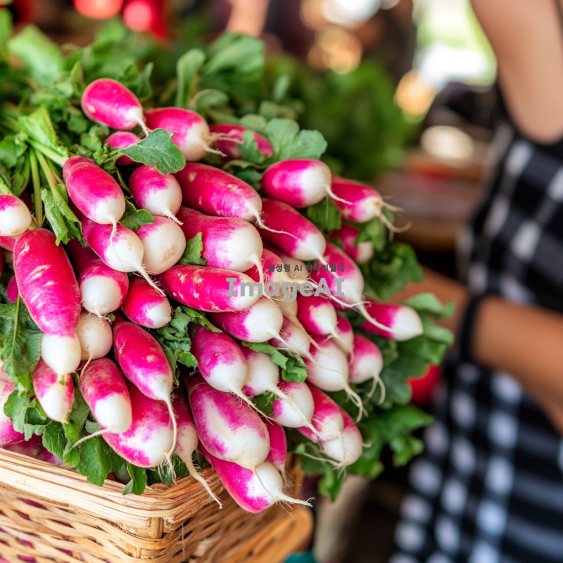 한국의 전통 무, 신선한 무의 세밀한 디테일, 자연광 속에서 촬영된 모습,