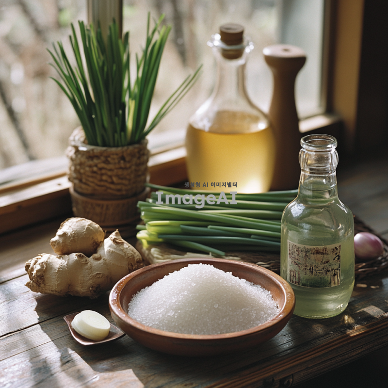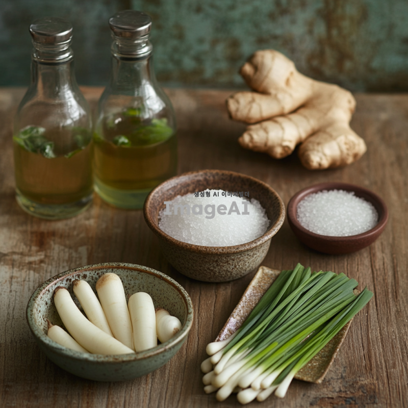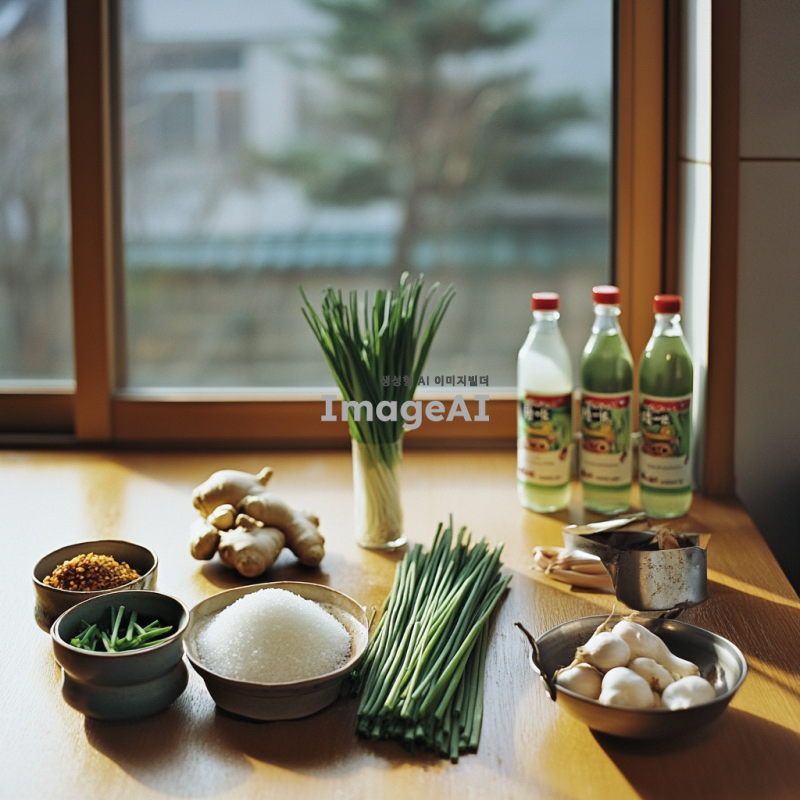 한국의 전통 주방, 조리대 위에 놓인 재료들: 무 1개, 굵은 소금 1/2컵, 물 2L, 설탕 1 큰 술 또는 알룰로스, 쪽파 또는 대파, 마늘 3쪽, 생강 1조각, 사이다 100ml. 이 재료들이 정갈하게 배열되어 있는 모습, 자연광이 비치는 따뜻한 분위기, 전통적인 한국식 주방의 느낌을 강조.