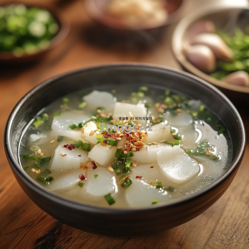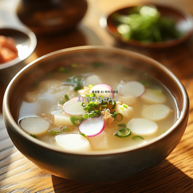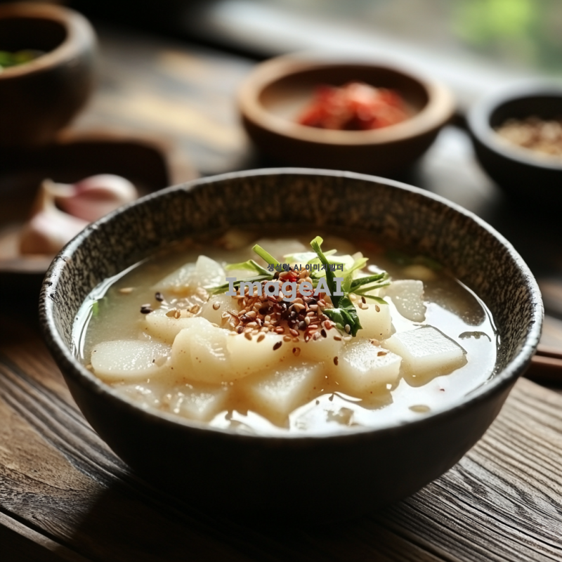 신선한 재료로 가득한 동치미 한 그릇, 투명한 국물에 아삭한 무, 마늘 조각이 담겨 있는 모습. 배경은 전통적인 한국의 식탁, 자연광이 비치는 따뜻한 분위기. 동치미의 시원한 느낌이 잘 드러나는 장면.