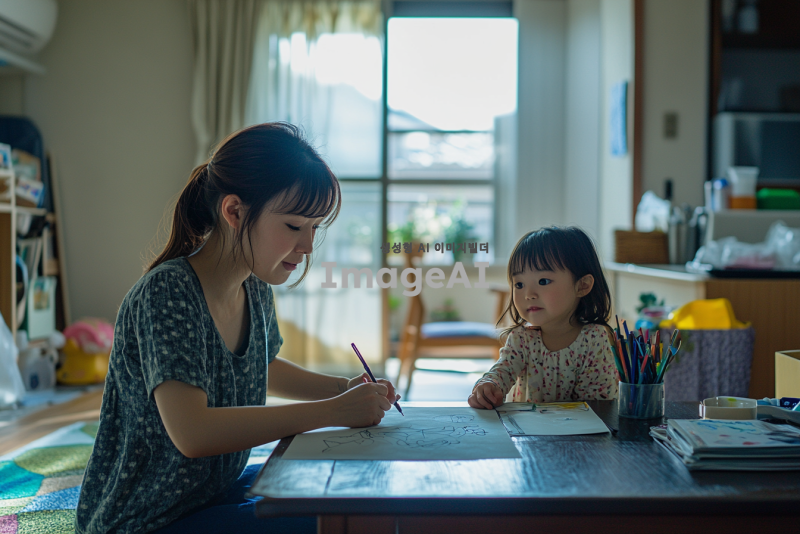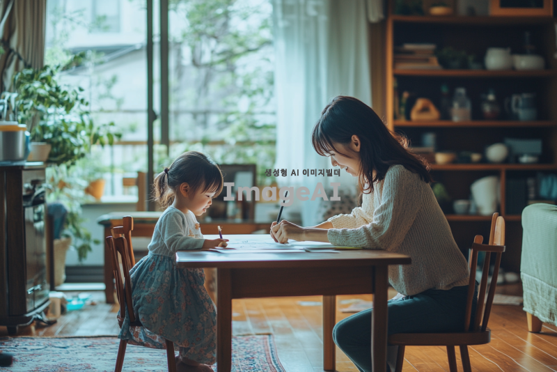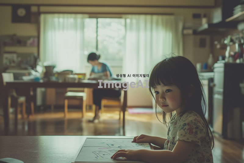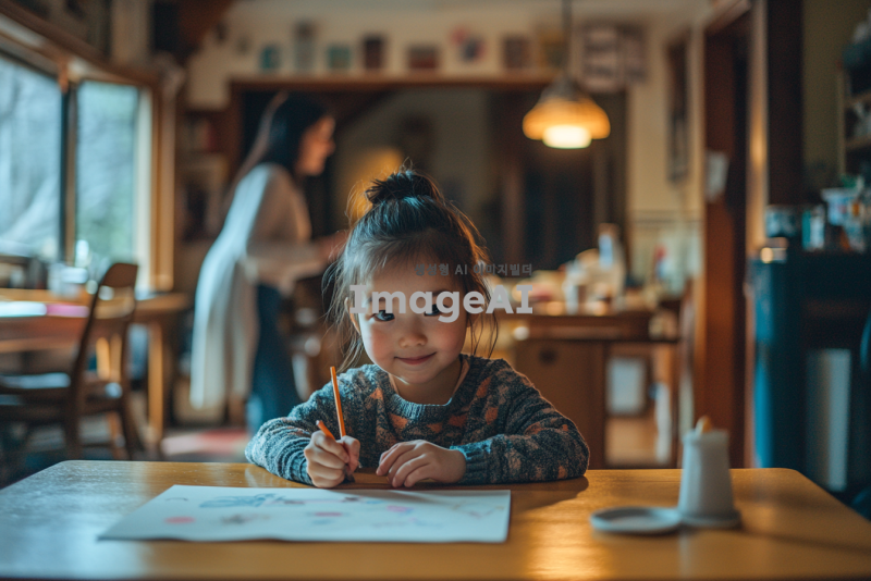 거실 바닥에 놓인 책상 앞에서 그림을 그리고 있는 5살 여자 아이. 30m 떨어진 식탁에서 접시를 닦고 있는 엄마. 엄마는 사랑스러운 표정으로 5살 여자 아이를 부르고 있으며, 엄마의 가슴에서 사랑의 빛이 5살 여자 아이의 가슴으로 들어가고 있다. 5살 여자 아이는 함박 웃음을 지으며 엄마를 바라보고 있는 모습. 따뜻하고 사랑이 넘치는 가족의 순간을 담아내는 장면.