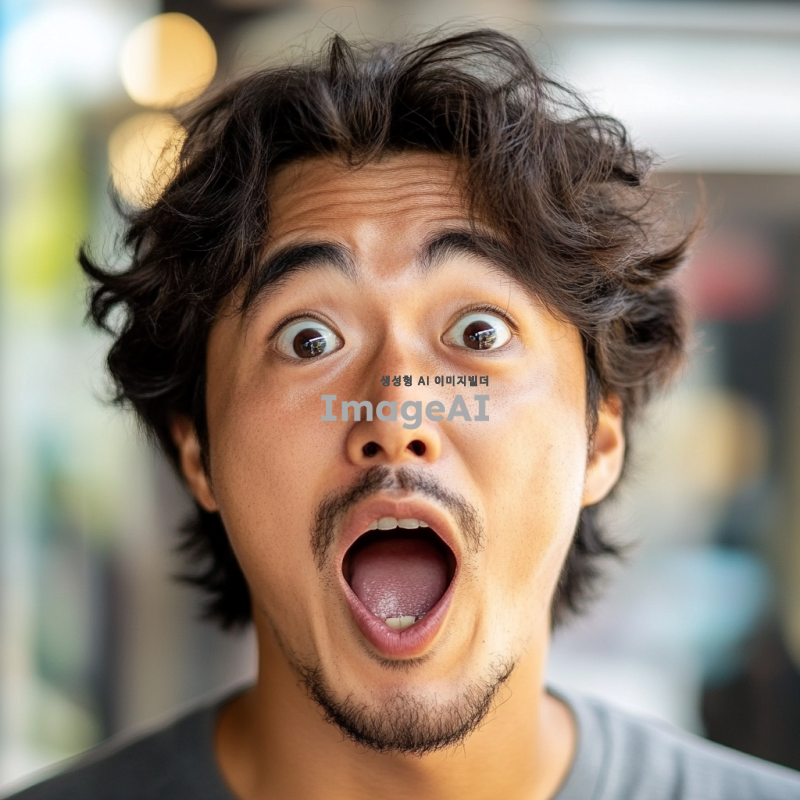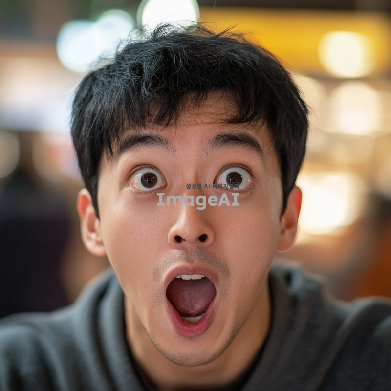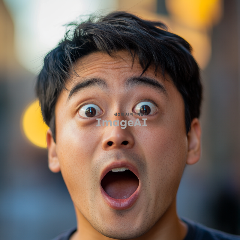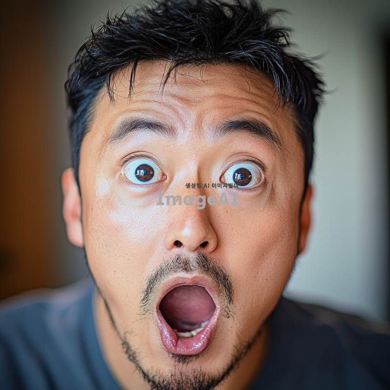 놀라운 발견을 한 듯한 표정의 한국인 남성, 눈이 크게 뜨이고 입이 벌어진 모습, 배경은 흐릿하게 처리되어 집중이 잘 되도록, 자연스러운 조명과 생생한 색감, 감정이 잘 드러나는 얼굴의 디테일 강조