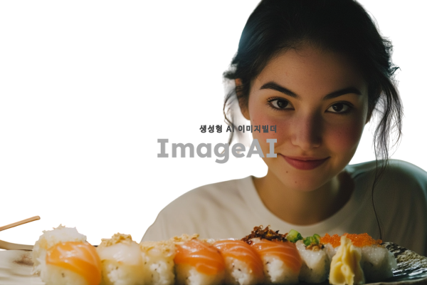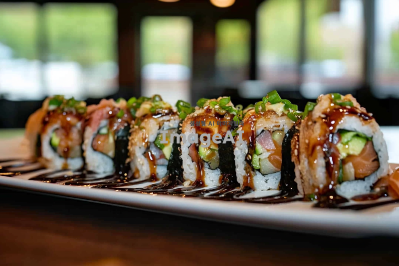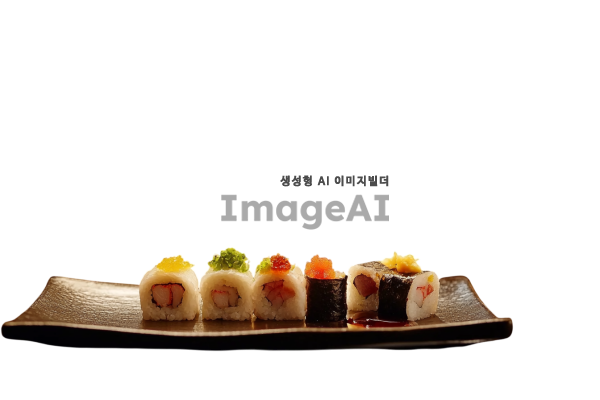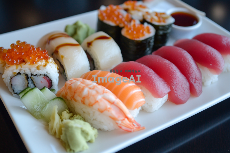 신선한 재료로 만든 다양한 종류의 스시가 정갈하게 담긴 일본식 접시, 배경에는 전통적인 일본식 식당의 인테리어가 보이고, 부드러운 조명이 스시의 색감을 강조하며, 맛있게 보이는 소스와 함께 제공되는 모습.