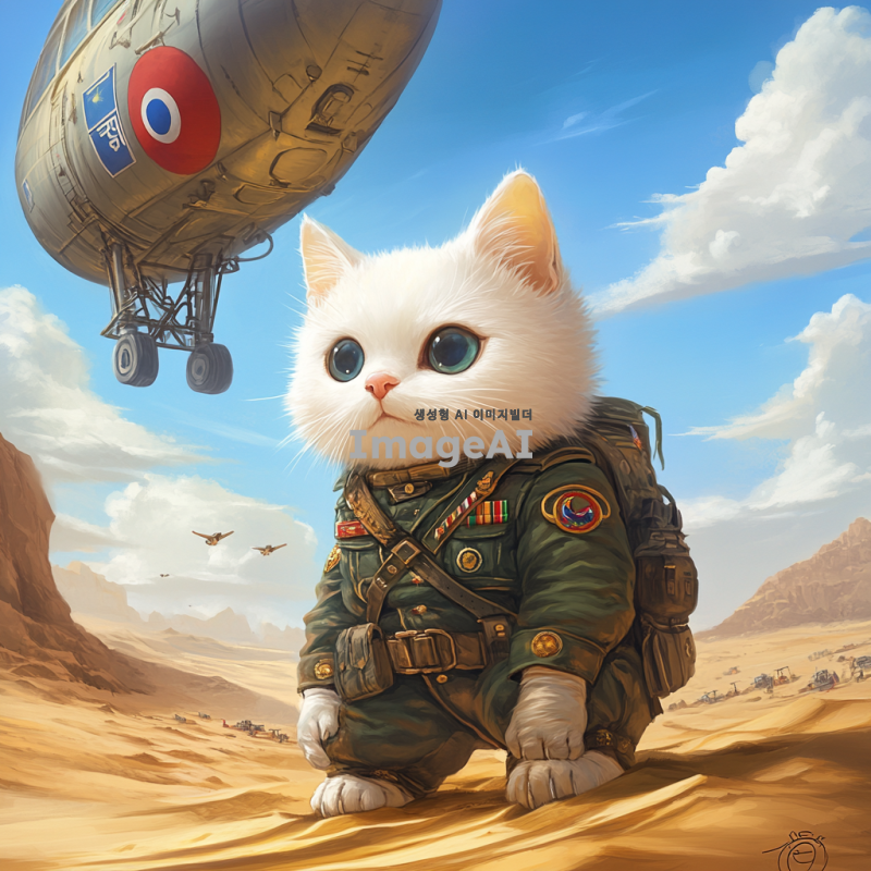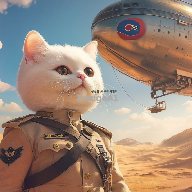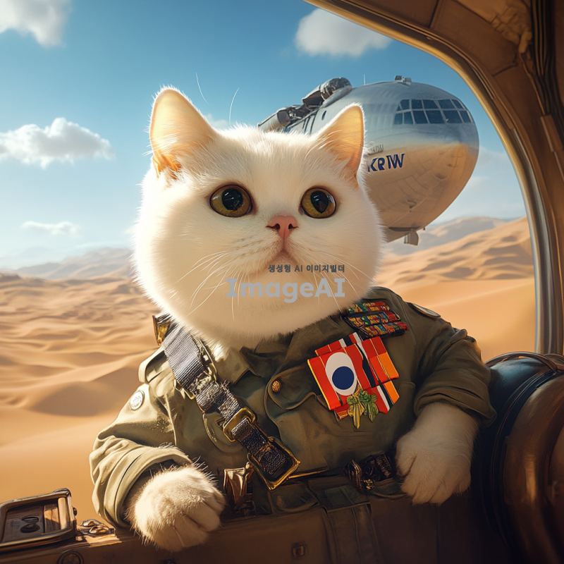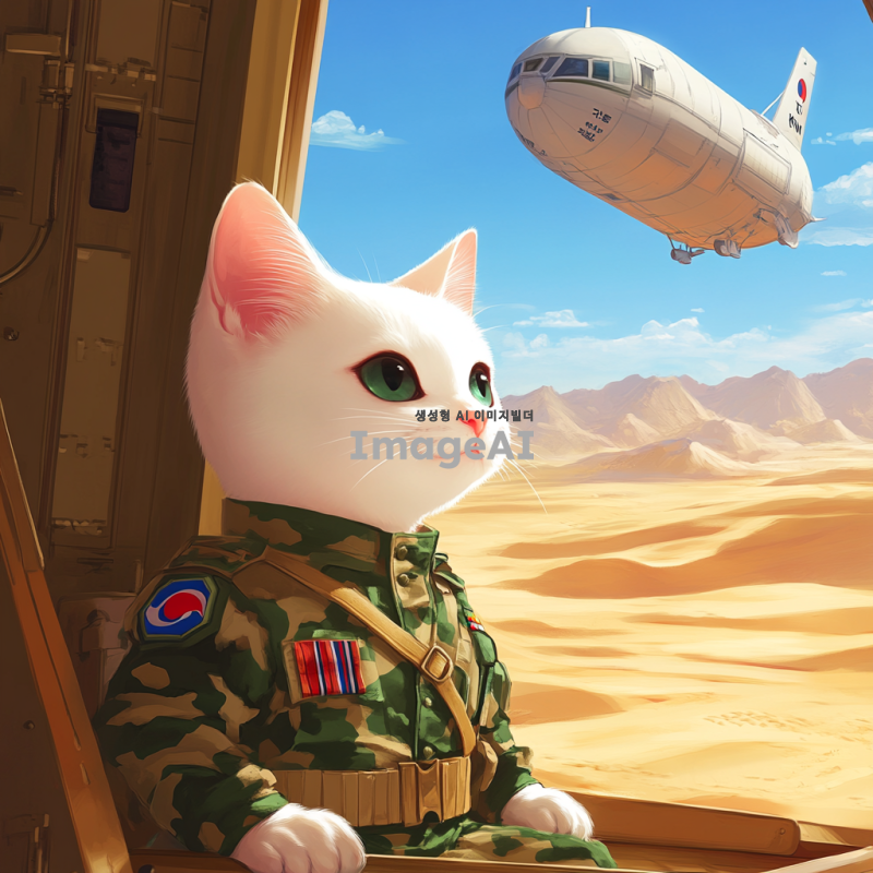 사막 배경에서 한국 국기를 상징하는 군복을 입고, KRW 로고가 새겨진 비행선에 탑승한 하얀 털의 예쁜 고양이. 고양이는 바깥 풍경을 바라보며 호기심 가득한 표정을 짓고 있다. 햇빛이 강하게 비추는 사막의 황금빛 모래와 푸른 하늘이 조화를 이루고 있는 모습.