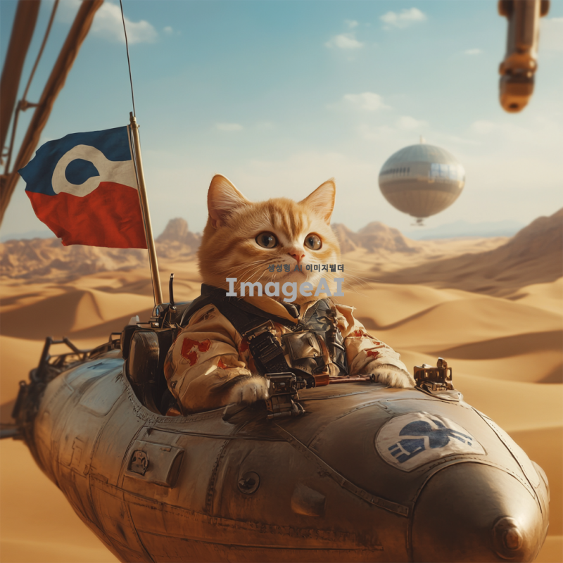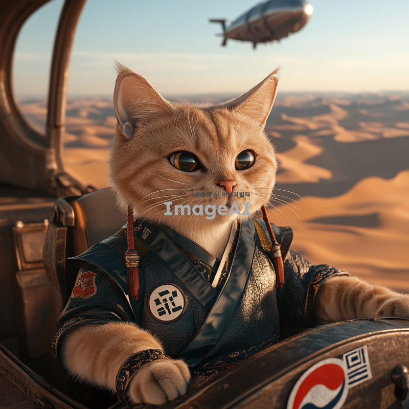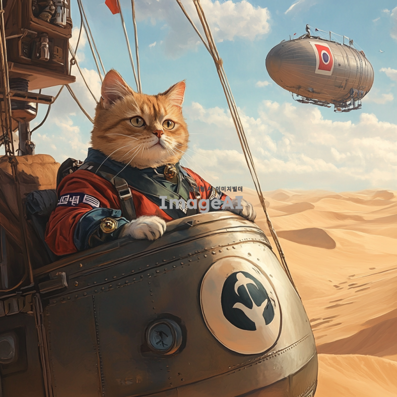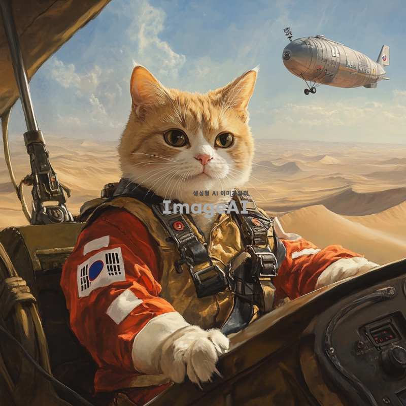 사막 배경에서 한국 국기의 군복을 입은 하안색 털의 고양이가 KRW 로고가 적혀 있는 비행기을 타고 있는 모습. 고양이는 자신감 넘치는 표정으로 비행선의 조종석에 앉아 있으며, 먼 배경에는 태양이 뜨고 있는 모습이 보인다. 비행선은 독특한 디자인으로, 한국의 전통적인 요소가 가미되어 있다. 사막의 모래 언덕과 푸른 하늘이 조화를 이루는 장면.