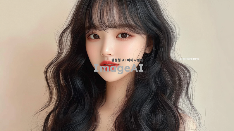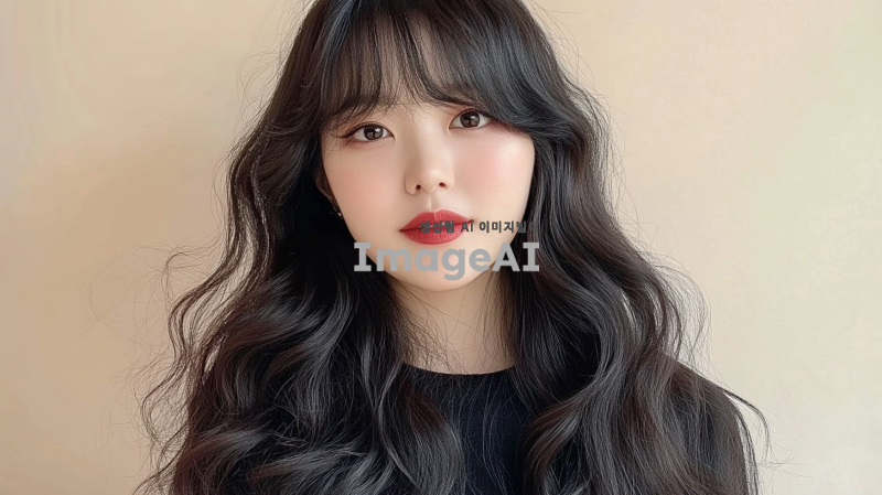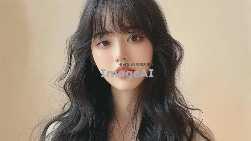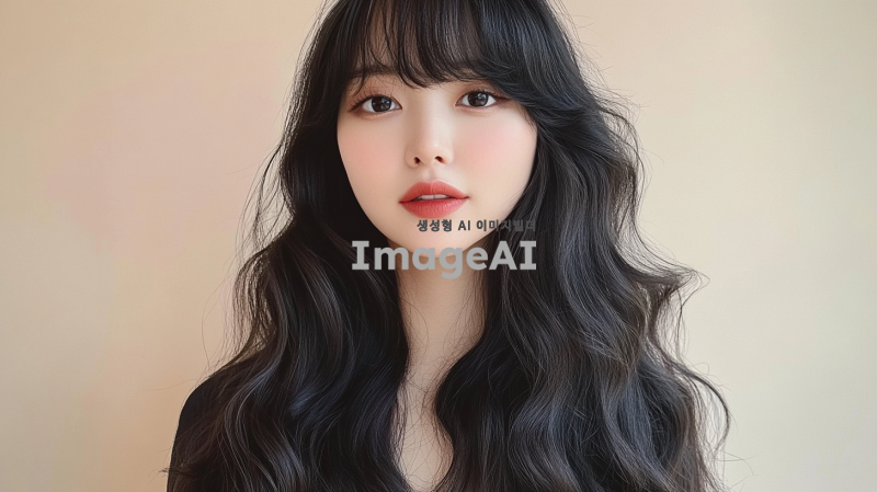 30대 중반 한국의 평범한 여성, 긴 머리, 앞머리, 검은색, 느슨한 웨이브로 스타일링. 사진은 부드러운 베이지색 배경에서 그녀의 생기 있는 개성을 포착해야 함. 그녀는 밝은 표정을 지으며 어깨 주위로 우아하게 떨어지는 두꺼운 웨이브 머리를 보여줌. 그녀의 메이크업은 옅고 자연스럽다.