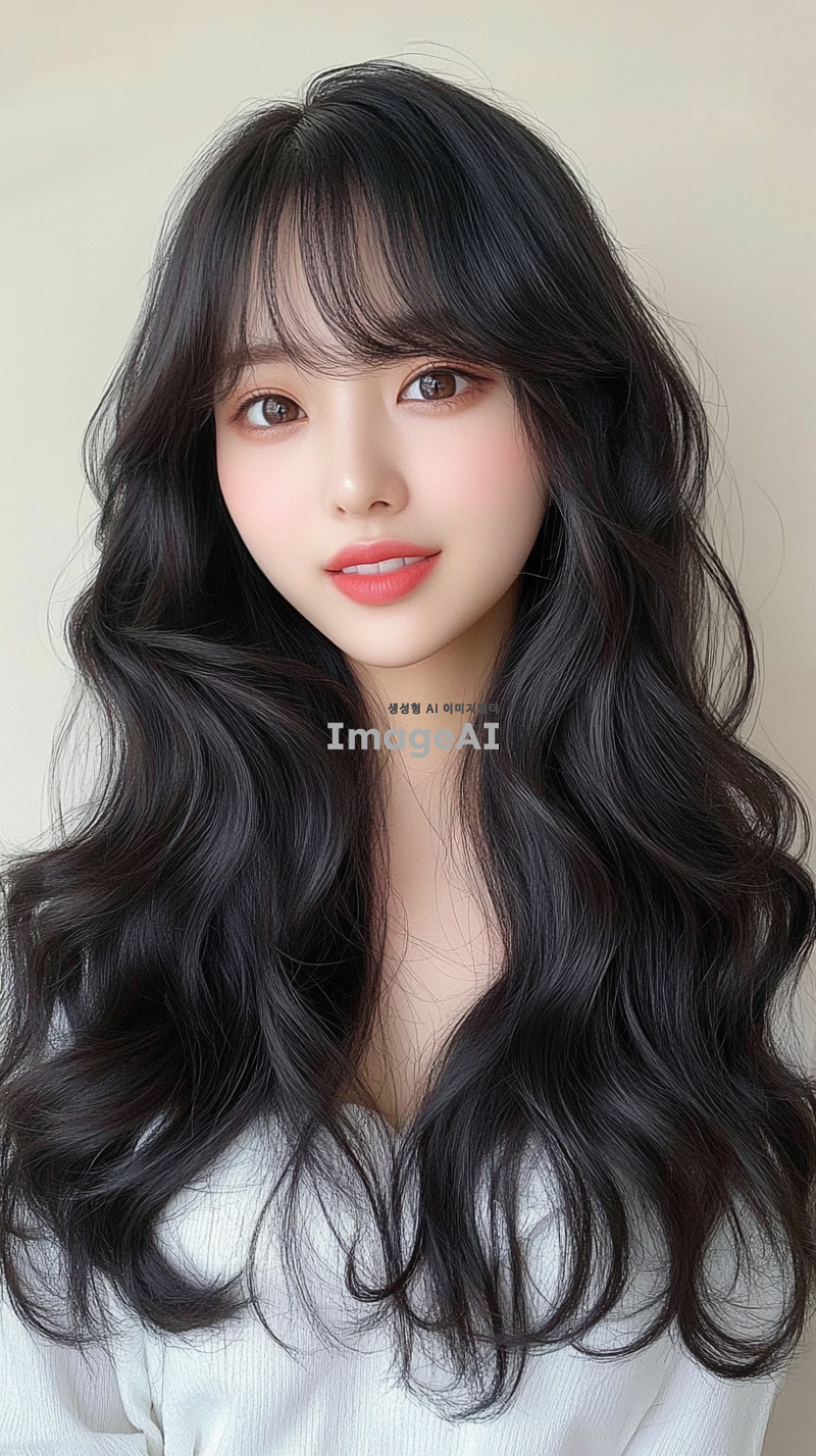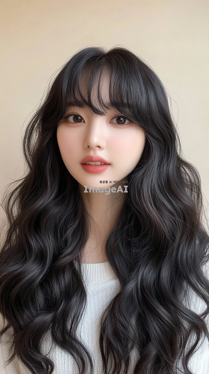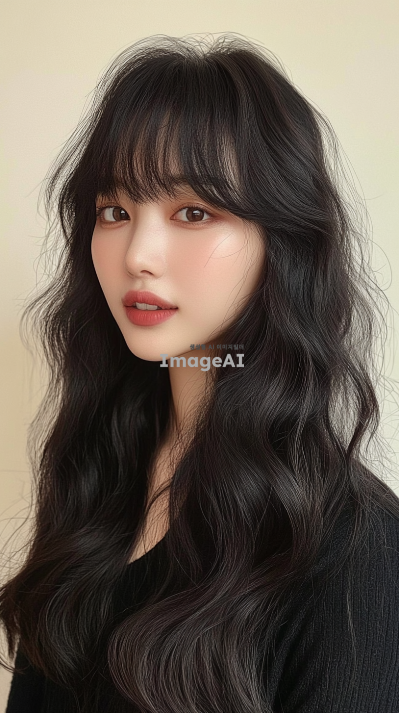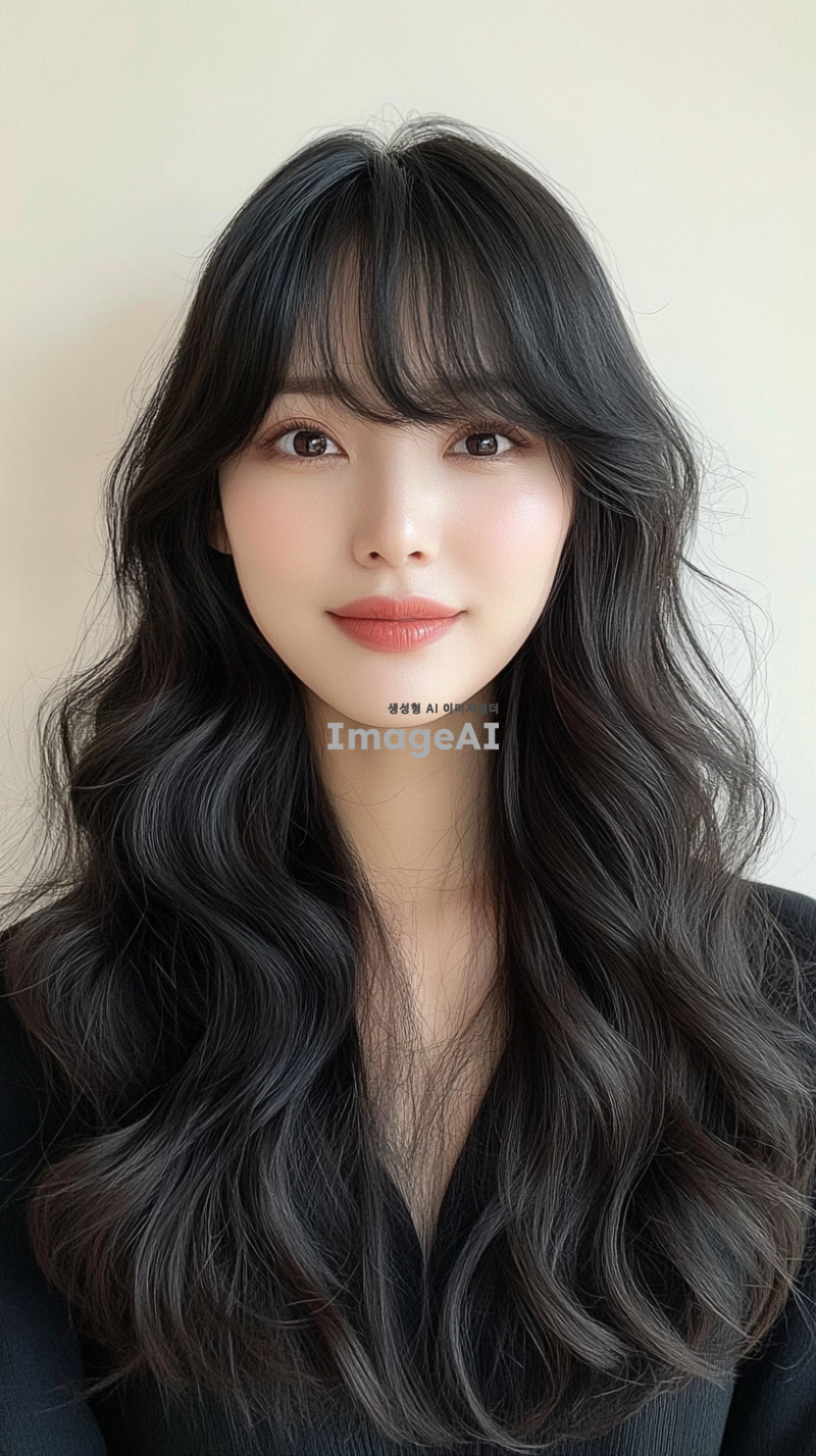 30대 후반의 한국의 평범한 여성, 긴 머리, 앞머리, 검은색, 느슨한 웨이브로 헤어 스타일링. 사진은 부드러운 베이지색 배경에서 그녀의 생기 있는 개성을 포착해야 함. 그녀는 밝은 표정을 지으며 어깨 주위로 떨어지는 두꺼운 웨이브 머리를 보여줌. 그녀의 메이크업은 자연스럽다.