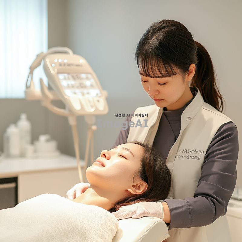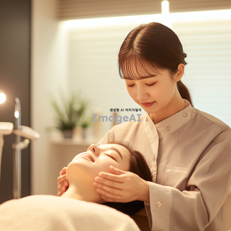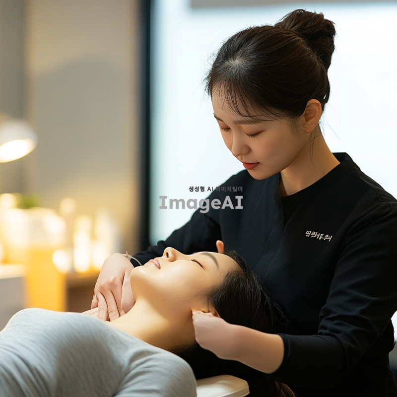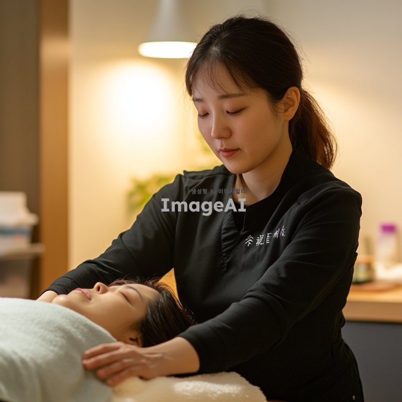 목이나 허리를 도수치료하고 있는 한국인 물리치료사의 모습. 환자는 편안한 자세로 누워 있고, 물리치료사는 집중한 표정으로 치료를 진행하고 있다. 치료실은 아늑하고 깨끗한 분위기로, 다양한 치료 기구와 장비들이 배치되어 있다. 조명이 부드럽고 따뜻한 느낌을 주며, 치료사가 환자의 상태를 세심하게 살피고 있는 장면을 담아낸다.