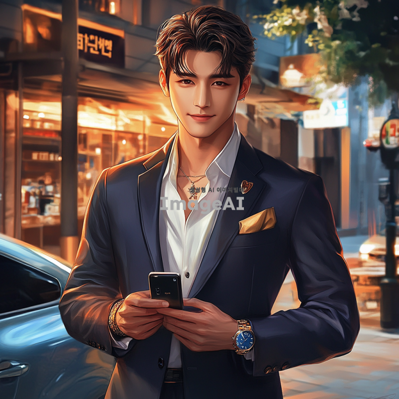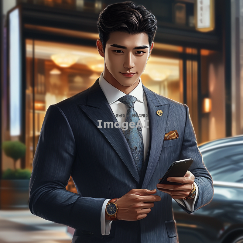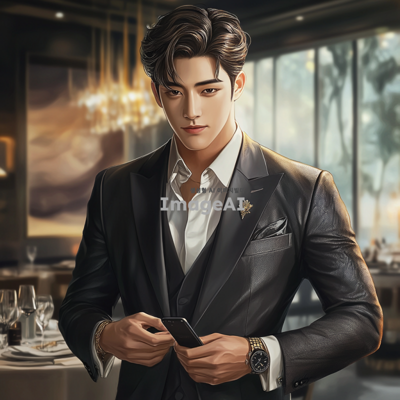고급스러운 정장을 입고 있는 한국 남성 캐릭터, 세련된 헤어스타일과 자신감 넘치는 표정, 배경에는 고급 레스토랑이나 럭셔리 자동차가 보이는 풍경, 손에는 고급 시계나 스마트폰을 들고 있는 모습, 전체적으로 부유함과 품위를 강조하는 분위기.