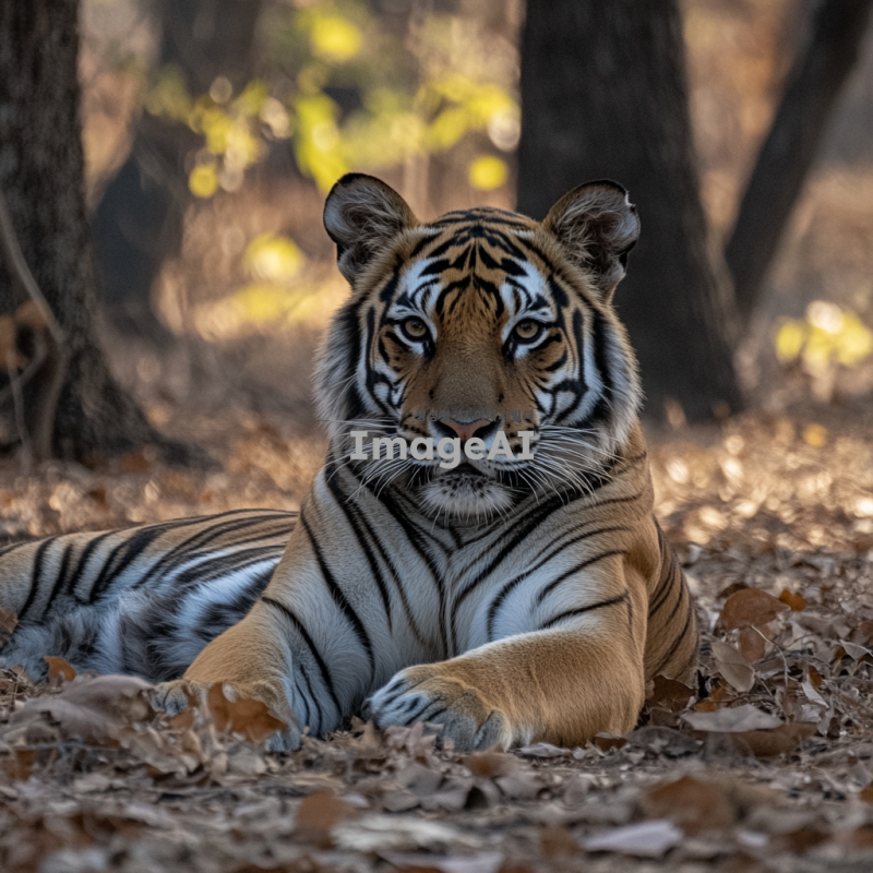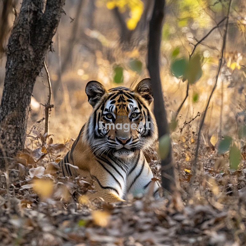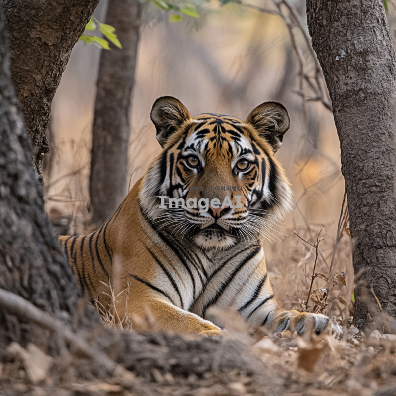 용맹하면서 자상한 표정을 가진 호랑이가 숲속에서 편안하게 앉아 있는 모습