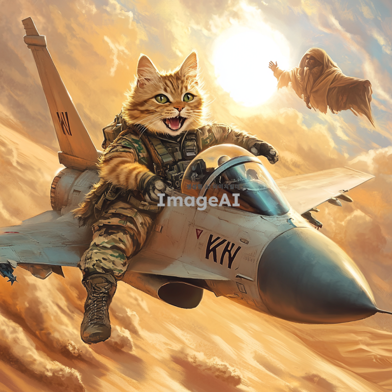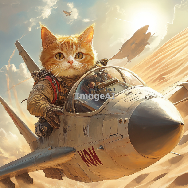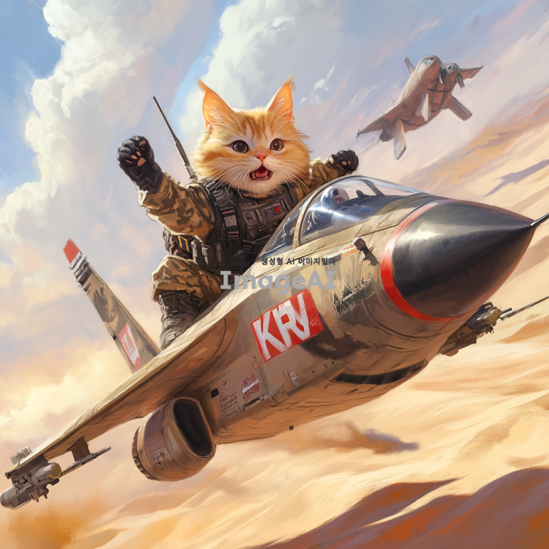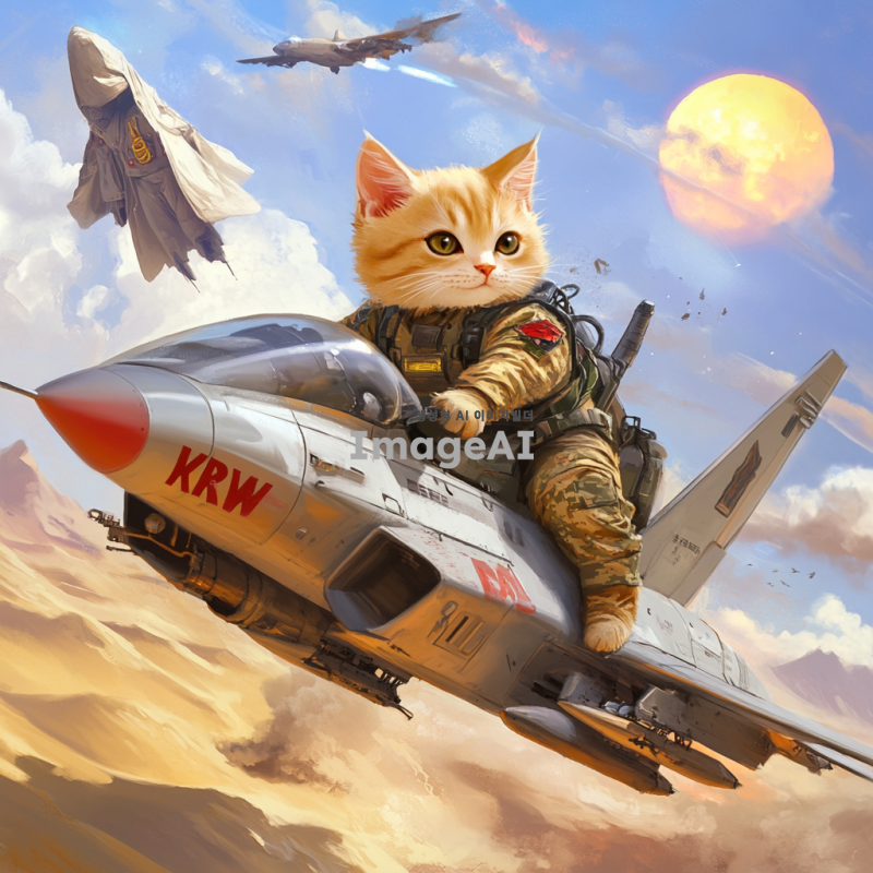 사막 배경에서 군복을 입은 하안색 털의 고양이가 KRW가 적혀 있는 전투기를 타고 있는 모습. 고양이는 귀여운 표정을 짓고 있으며, 전투기는 역동적으로 하늘을 날고 있다. 배경에는 뜨거운 태양과 모래 언덕과 미라가 펼쳐져 있다.