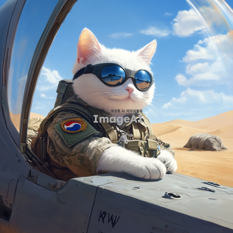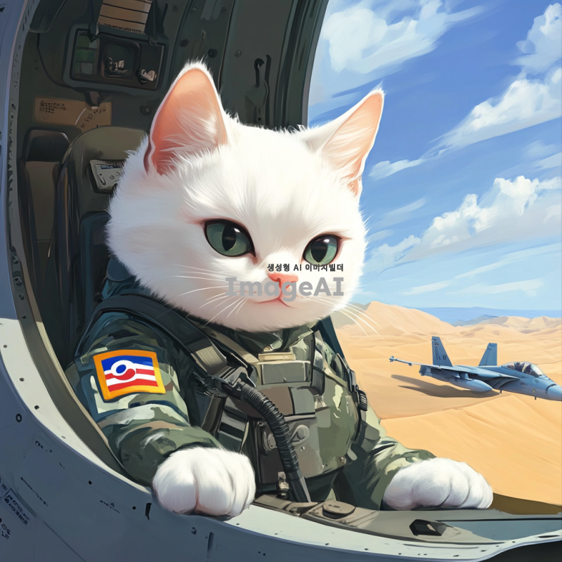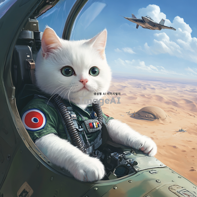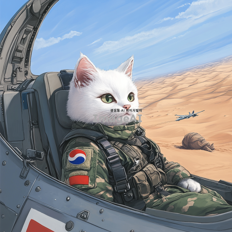 사막의 푸른 하늘 아래, 대한민국 국기의 군복을 입고 KRW가 적힌 전투기을 타고 있는 귀여운 하얀 털의 고양이. 고양이는 전투기의 창가에 앉아 외부를 바라보고 있으며, 사막의 모래 언덕과 미라가 있고 드넓은 하늘이 배경을 이루고 있다. 고양이의 눈은 호기심 가득하며 사랑스럽고 귀엽다