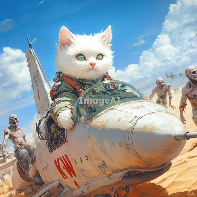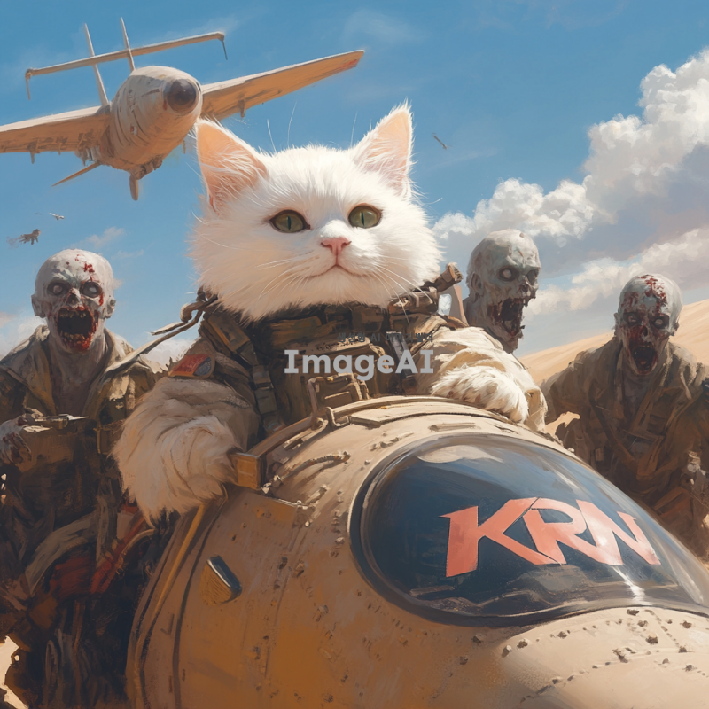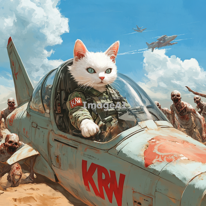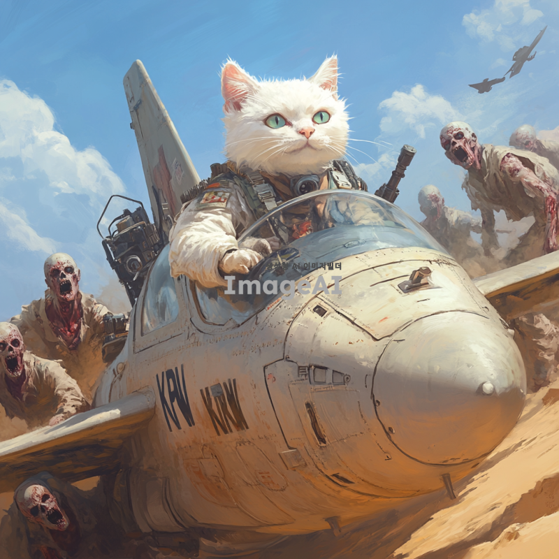 사막의 푸른 하늘 아래, 군복을 입고 KRW 로고가 새겨진 전투기에 탄 하얀색털의 고양이. 비행선 주변에는 좀비가 있으며, 사막의 황금빛 모래와 대비되는 장면. 고양이는 사랑스러운 표정으로 주위를 보고 있다.