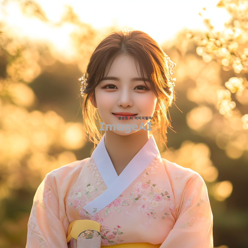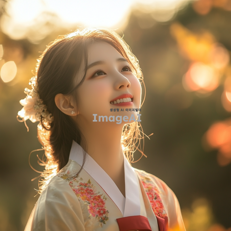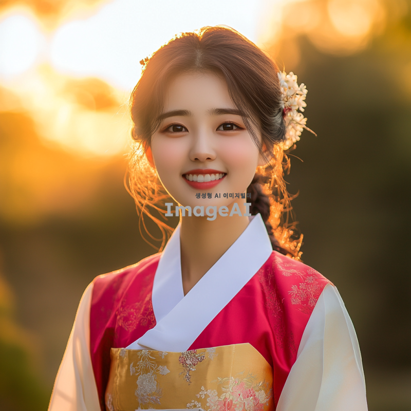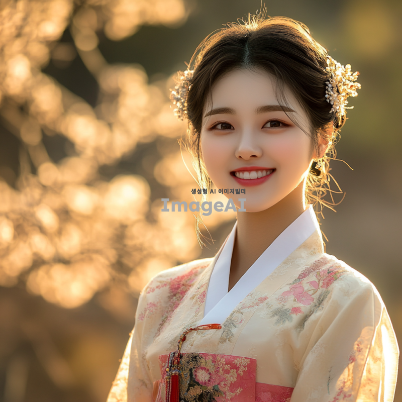 한국의 전통 의상을 입은 젊은 여성, 아름다운 자연 배경 속에서 환하게 웃고 있는 모습, 부드러운 햇살이 비치는 따뜻한 분위기, 생동감 넘치는 표정과 함께 자연과 조화를 이루는 장면.