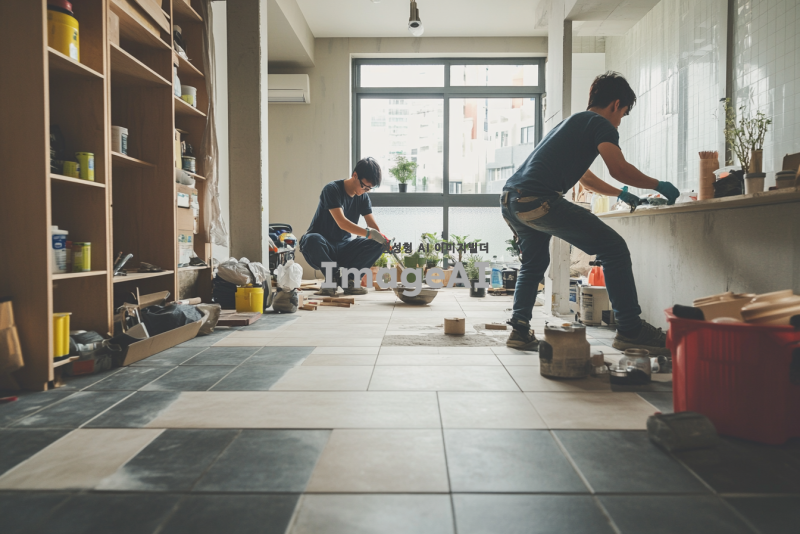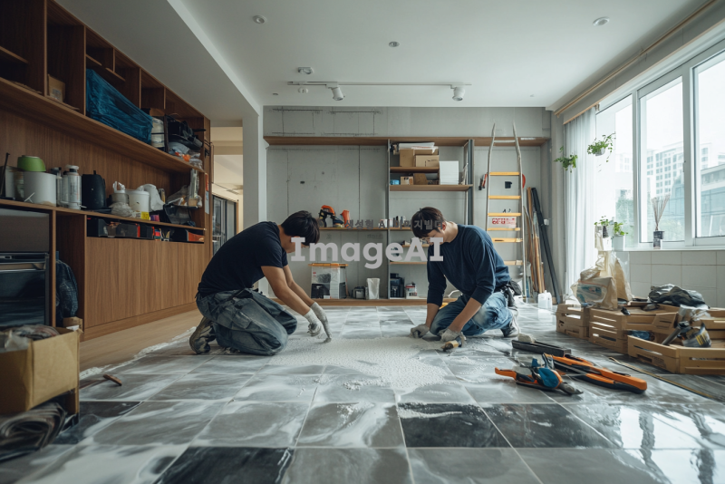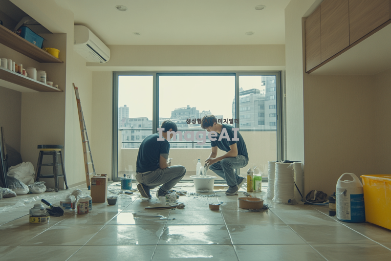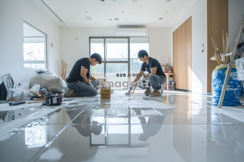 한국 아파트 거실의 타일 바닥에서 줄눈 작업을 하고 있는 장면. 한 작업자는 타일 사이에 줄눈을 넣고 있으며, 다른 작업자는 그 과정을 가르치고 있는 모습. 작업자는 젊은 남성으로, 가르치는 사람은중간연령대의 남성. 주변에는 줄눈 재료와 도구들이 정리되어 있고, 아파트의 현대적인 인테리어가 배경에 보인다. 자연광이 들어오는 밝은 분위기.