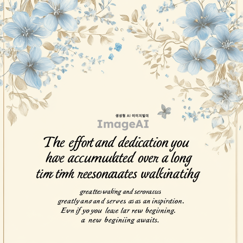 차분한 파스텔 색상의 배경에 퇴직의 품위와 안정감을 표현하며, 연한 베이지와 푸른 하늘색이 어우러진 이미지. 우아하고 간결한 서체로 "오랜 시간 한 길을 걸으며 쌓아오신 수고와 헌신은 큰 울림과 귀감이 됩니다."라는 문구가 적혀있고, 그 아래에는 "익숙했던 자리에서 떠나더라도, 새로운 시작이 기다리고 있습니다."라는 문구가 배치되어 있습니다. 배경에는 은은한 꽃과 책, 그리고 길을 상징하는 이미지가 조화롭게 배치되어 있으며, 심플한 금색 또는 베이지 톤의 테두리로 강조된 프레임이 있는 디자인.