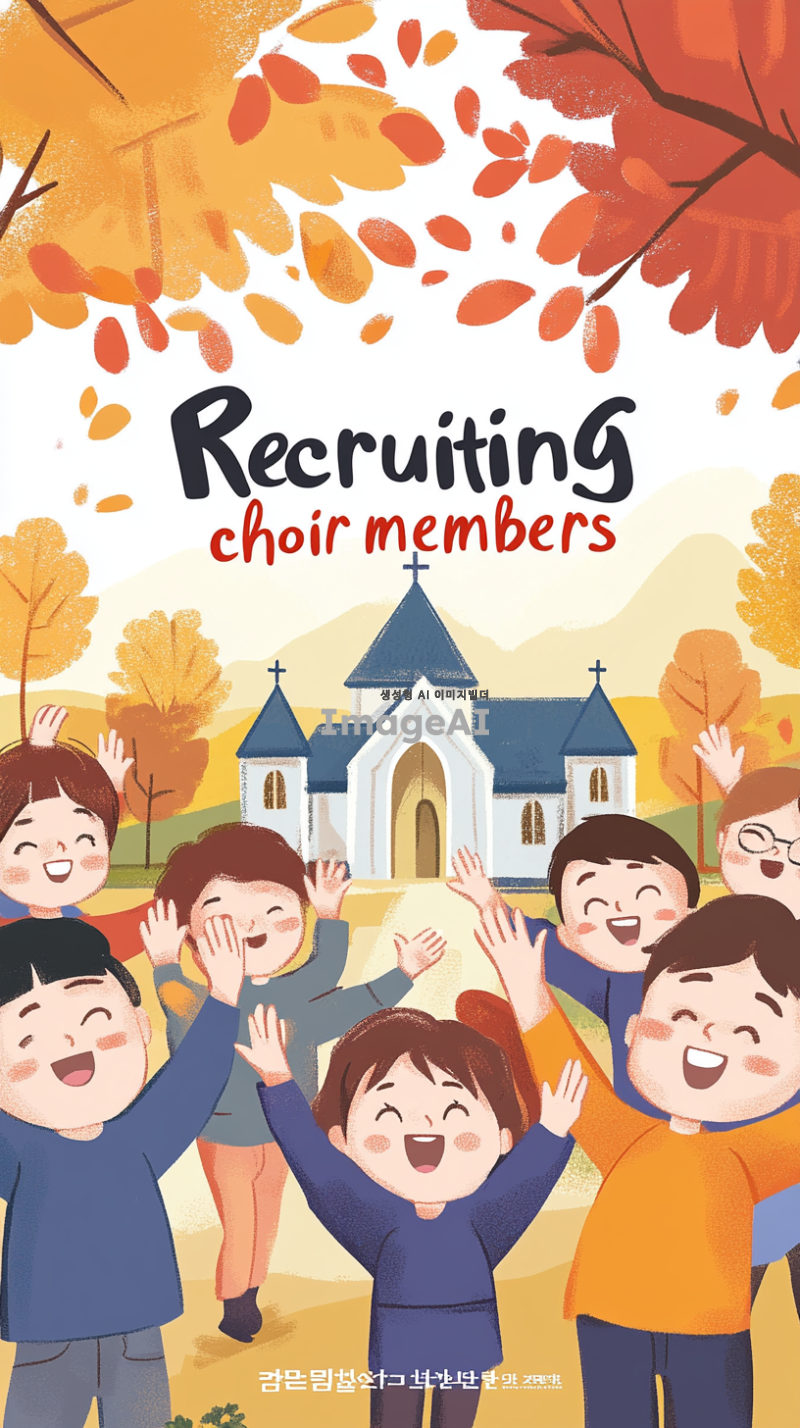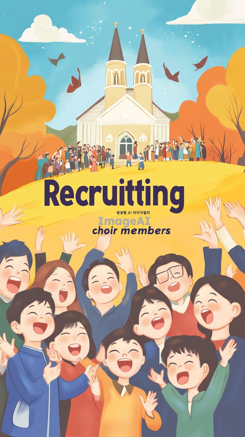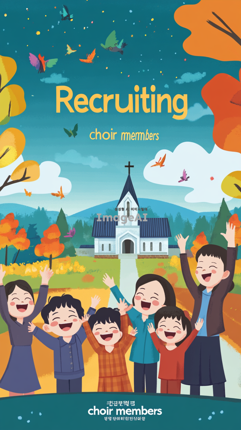 한국 교회 찬양대원 모집 광고 포스터. 다양한 연령대의 한국인들이 함께 즐겁게 찬양하는 모습, 아이들이 웃으며 손을 흔들고 어른들이 화답하며 노래하는 장면. 화사한 색감과 따뜻한 분위기로, 찬양의 기쁨과 화합을 강조한 이미지. 배경에는 교회와 자연이 어우러진 풍경, 포스터 중앙에는 "찬양대원 모집"이라는 문구가 돋보이도록 디자인.