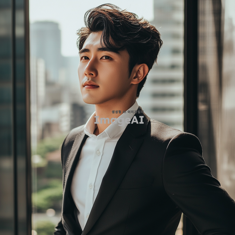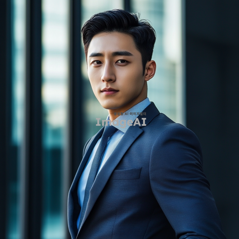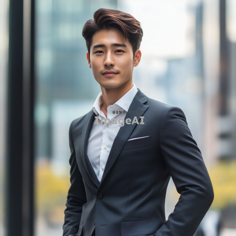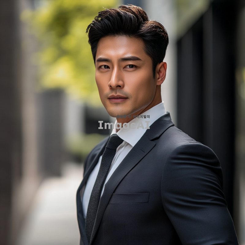 정장을 입고 자신감 넘치는 포즈를 취한 한국인 남성, 세련된 헤어스타일과 깔끔한 외모, 도시의 현대적인 배경, 자연광이 비치는 분위기, 전문적인 느낌의 이미지