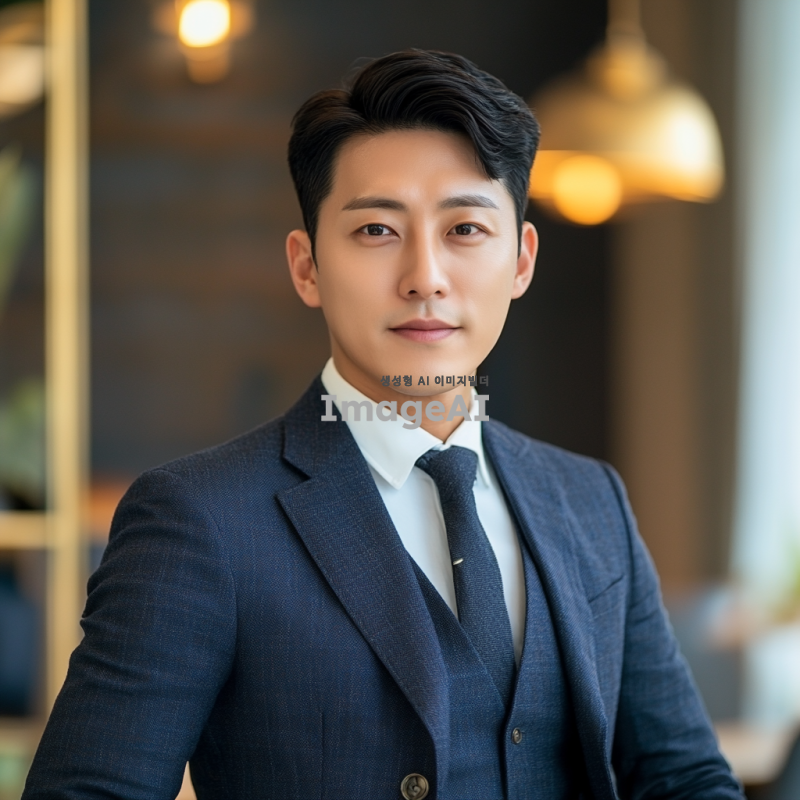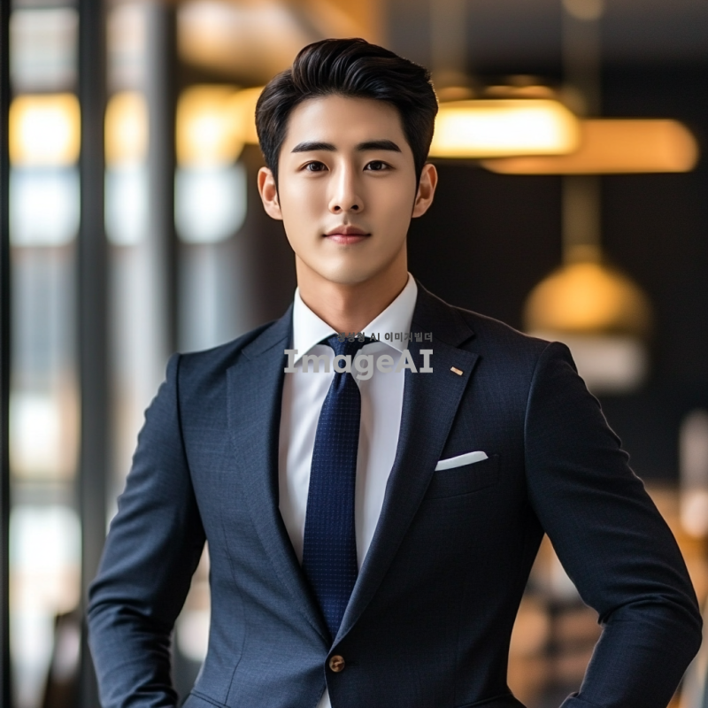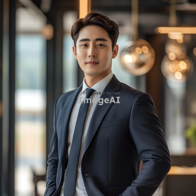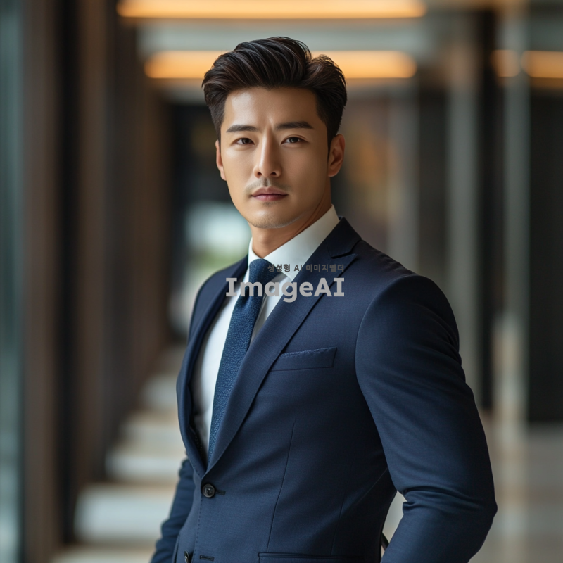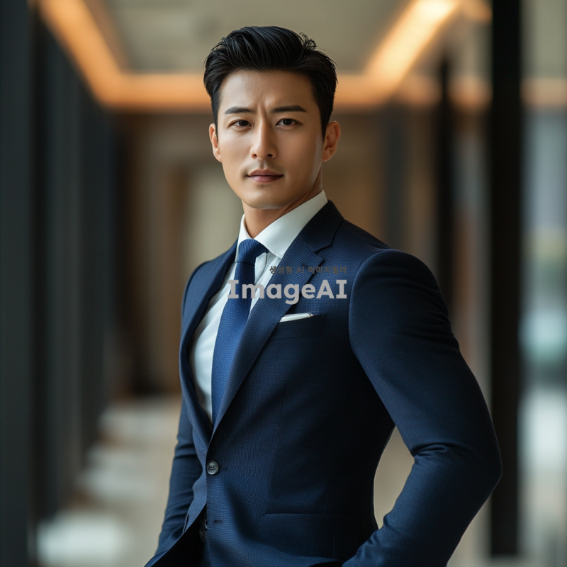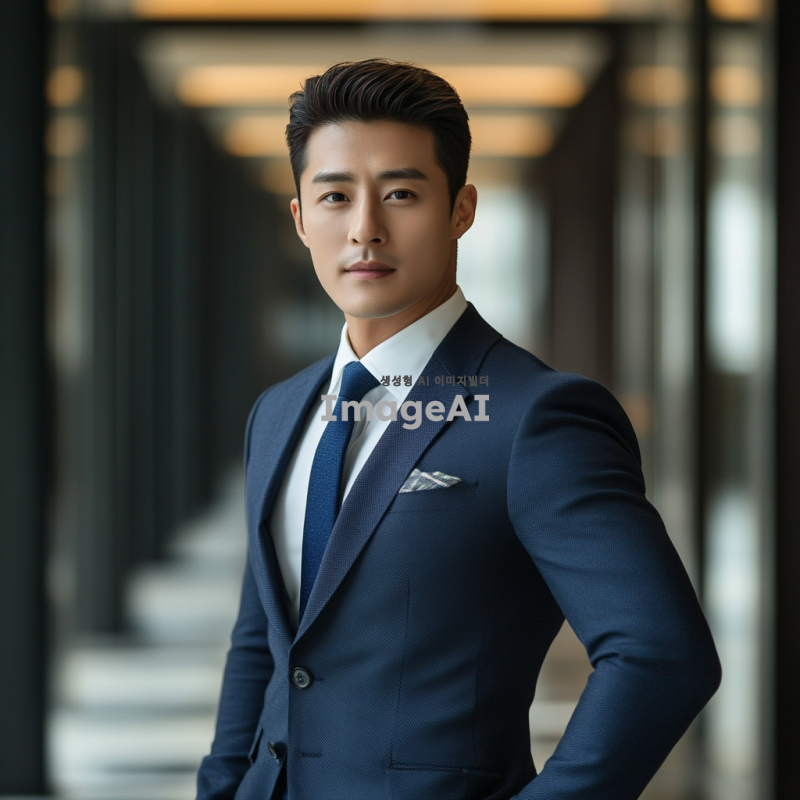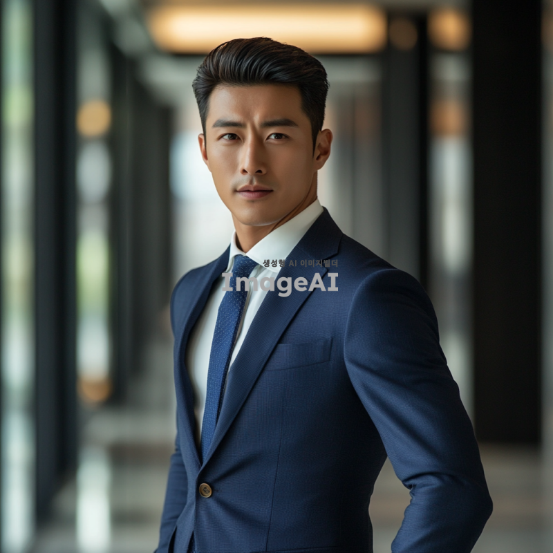 정장을 입고 있는 한국 남성, 세련된 비즈니스 스타일, 현대적인 금융사 사무실 내부 배경, 자신감 있는 포즈, 단정한 헤어스타일, 정장 색상은 어두운 네이비 블루, 흰색 셔츠와 넥타이, 전문적인 분위기