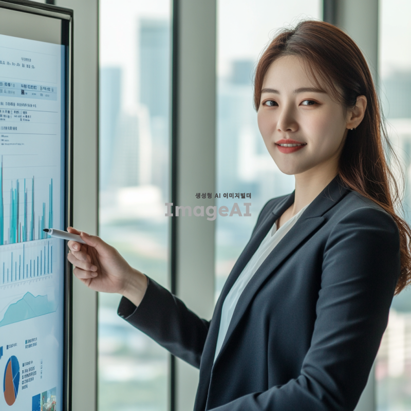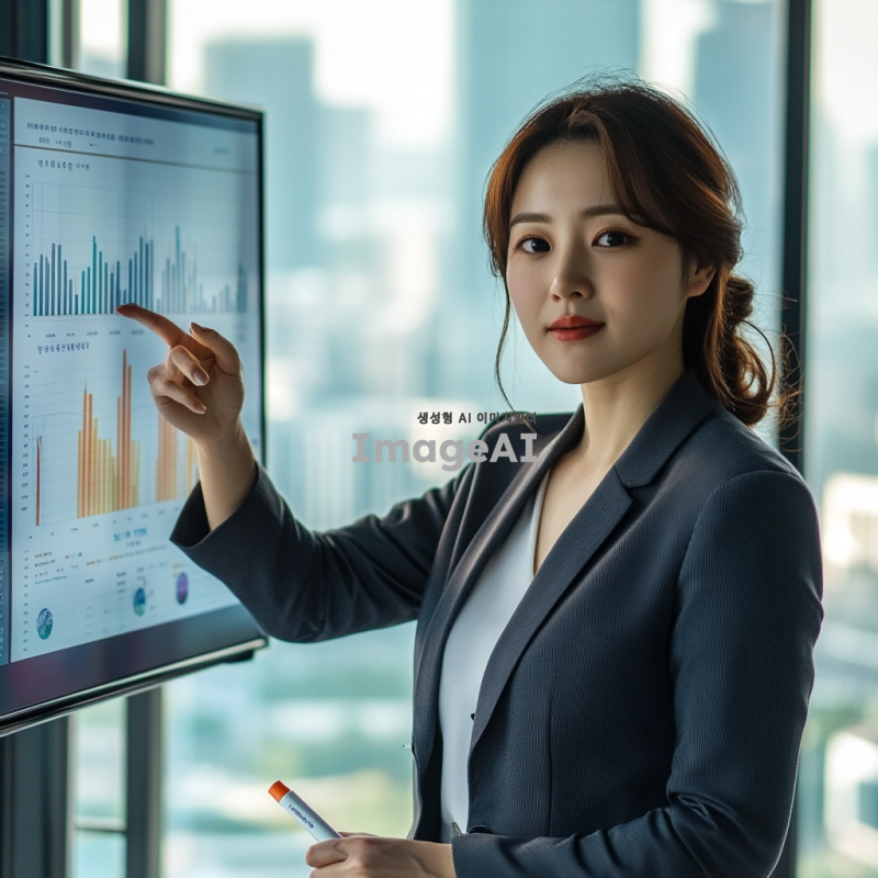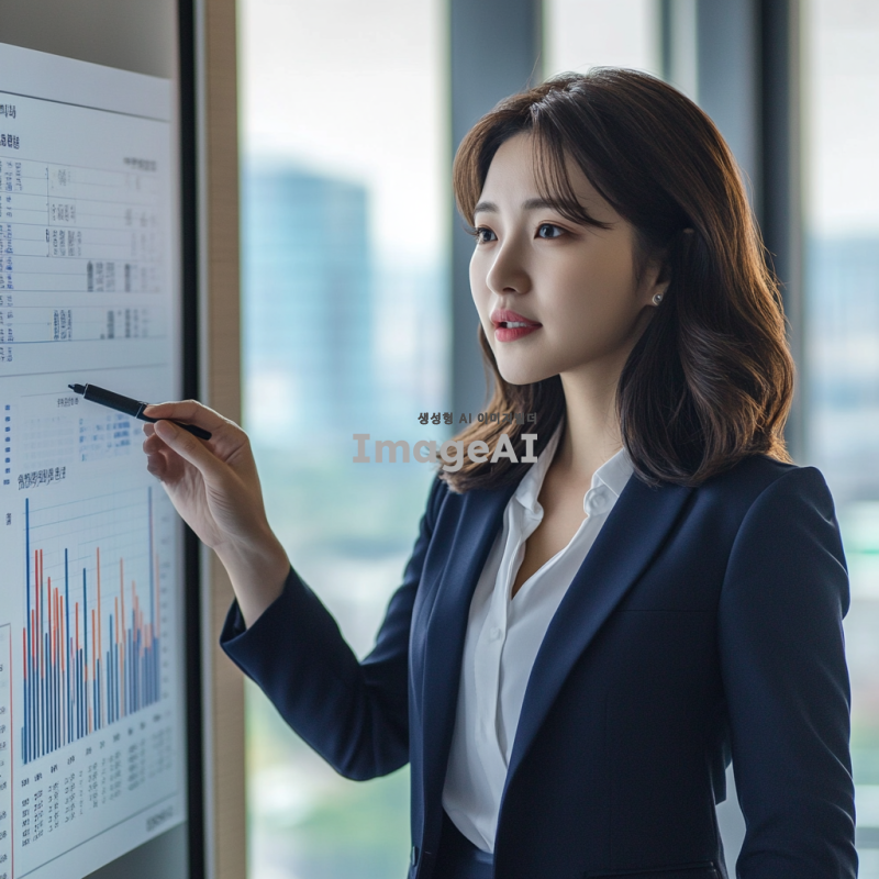 정장을 입고 그래프를 표시하고 있는 한국인 여성. 그녀는 회의실에 서 있으며, 그래프가 담긴 프레젠테이션 화면을 가리키고 있다. 배경은 현대적인 사무실 환경으로, 창문 너머로 도시 풍경이 보인다. 그녀의 표정은 자신감 넘치고 전문적이며, 손에는 마커를 쥐고 있다.
