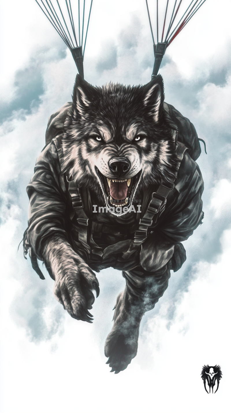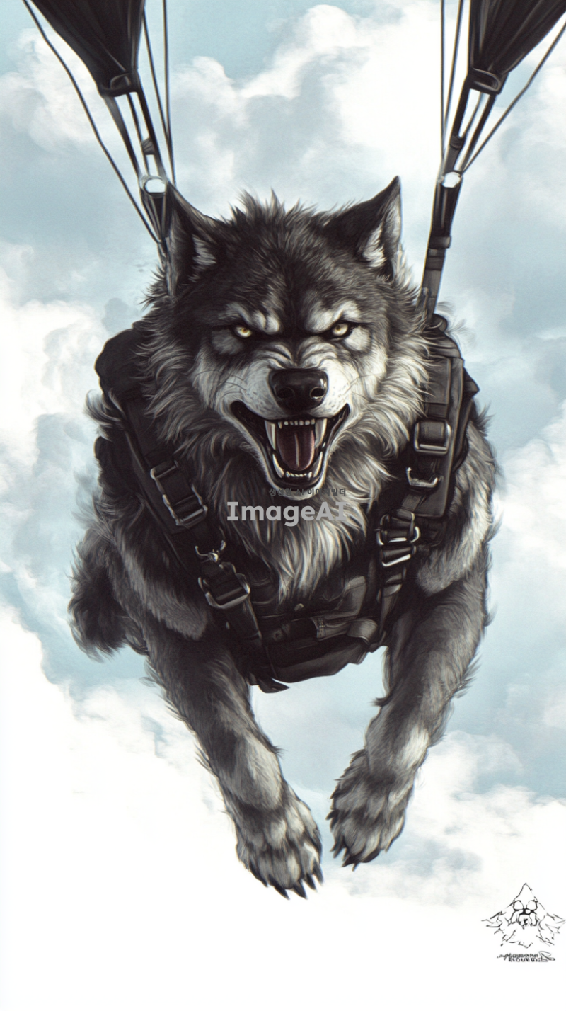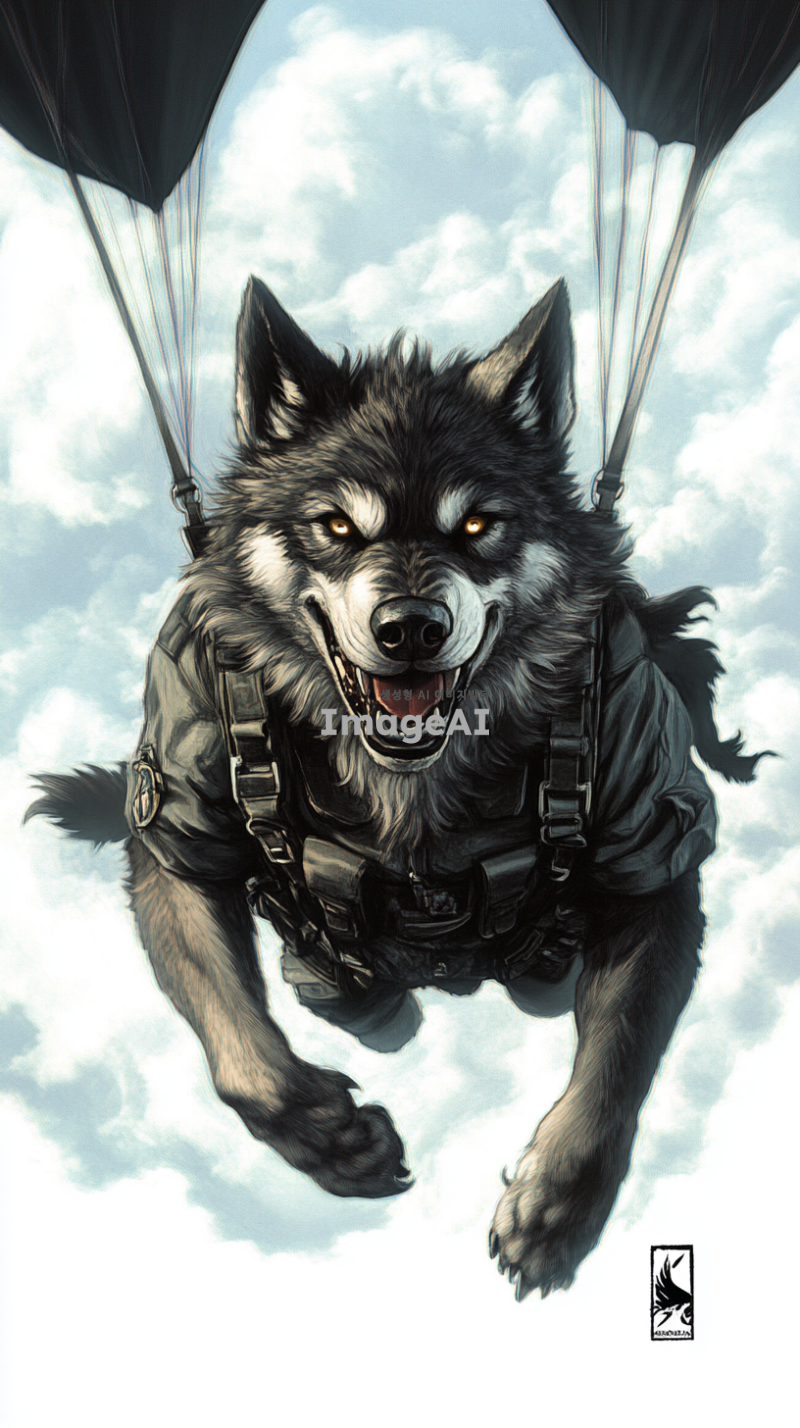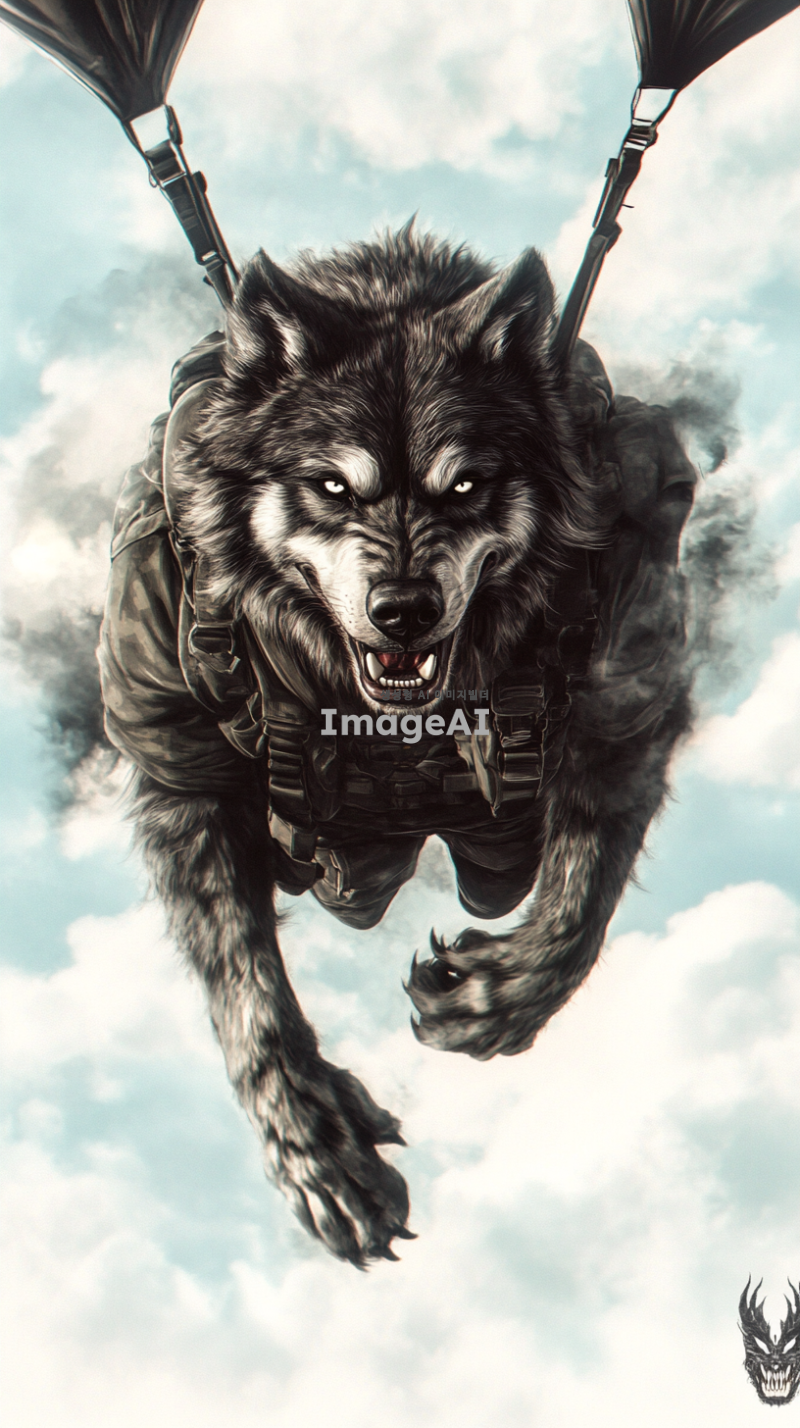 군복을 입고 낙하산을 타고 내려오는 늑대인간, 강렬한 표정과 함께 하늘에서 내려오는 모습, 배경은 푸른 하늘과 구름, 늑대인간의 털과 군복의 디테일이 잘 보이도록, 액션이 느껴지는 동적인 장면.