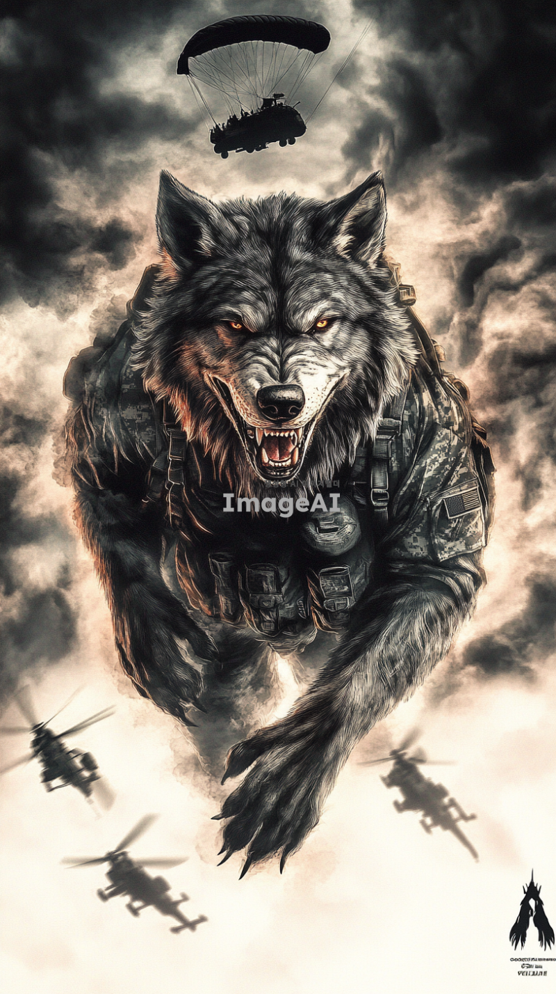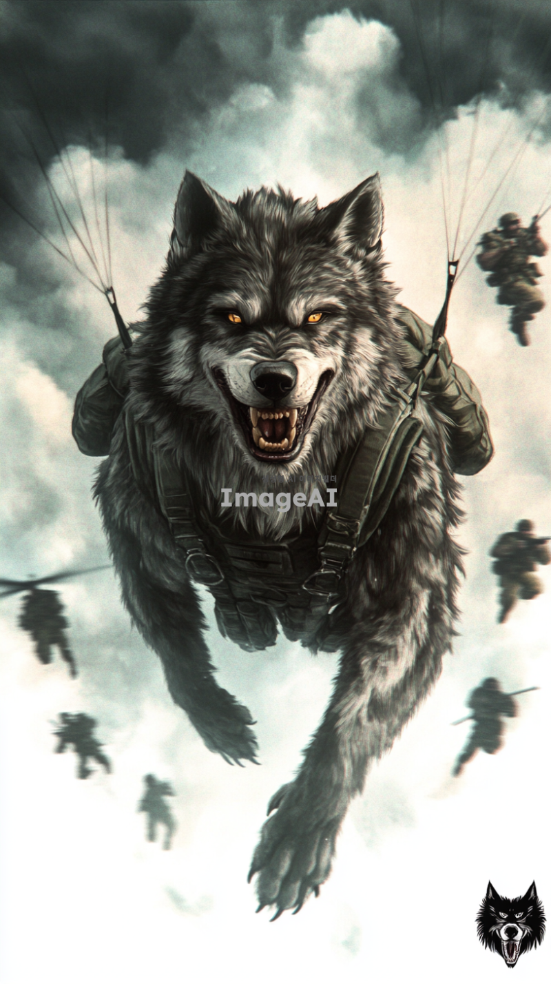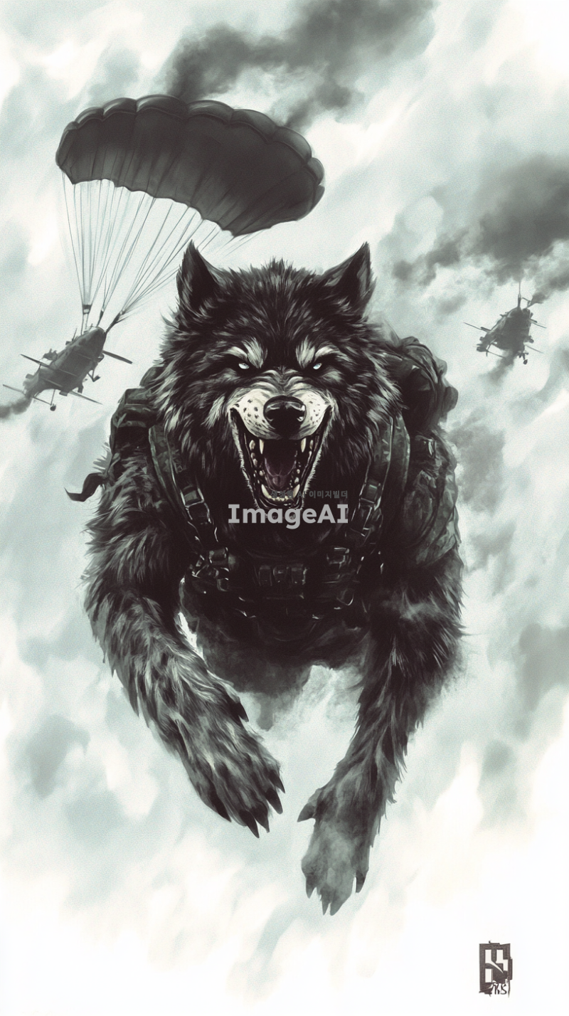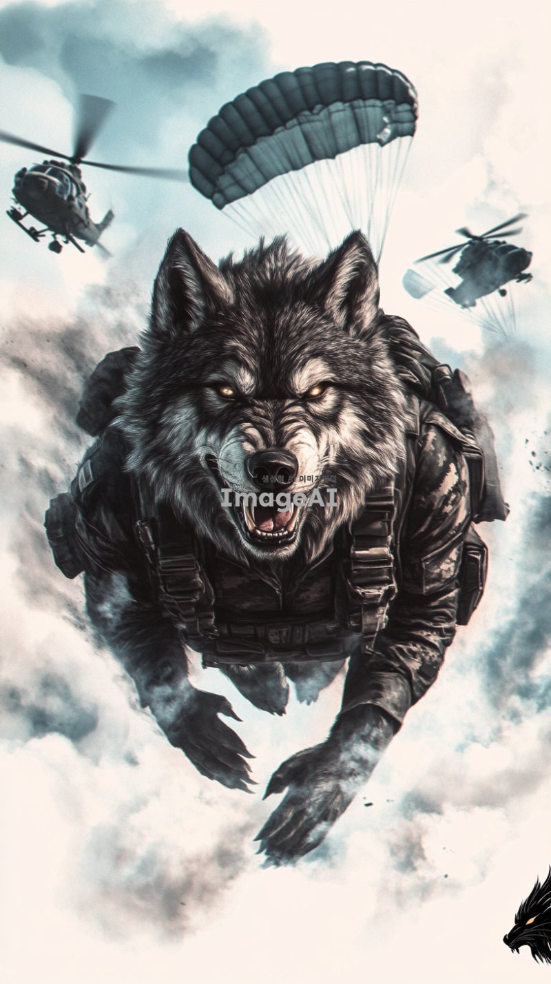 군복을 입고 낙하산을 타고 내려오며 서 있는 모션을 취하고 있는 늑대인간, 강렬한 표정을 지으며 하늘에서 내려오는 모습. 배경에는 군용 헬기가 작게 떠 있고, 뒤쪽에는 낙하산을 타고 내려오는 군인들이 보인다. 가운데에 있는 늑대인간이 가장 잘 돋보이며, 그의 낙하산이 완전히 드러나 있다. 늑대인간의 털과 군복의 디테일이 잘 보이도록 묘사된 동적인 액션 장면.