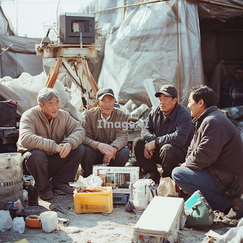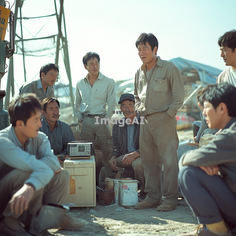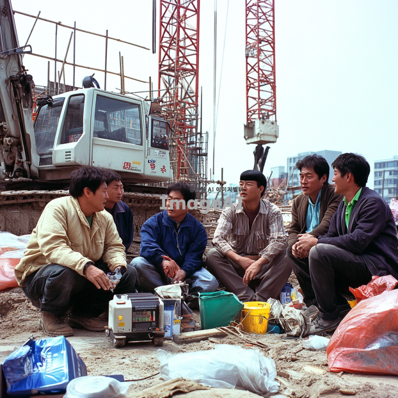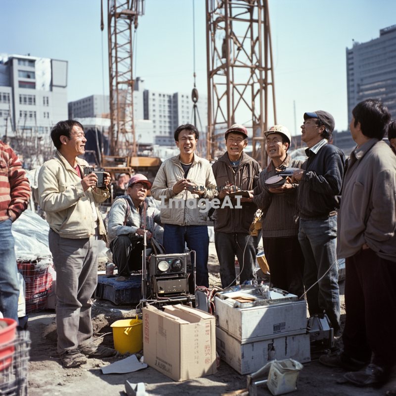 한국의 건설 현장에서 일하는 노동자들이 함께 모여 라디오를 들으며 소통하는 모습. 다양한 연령대의 남성과 여성들이 등장하고, 각자 작업복을 입고 있으며, 주변에는 건설 장비와 자재들이 널려 있다. 햇살이 비추는 따뜻한 날씨 속에서 편안한 분위기를 느낄 수 있는 장면. 라디오에서 나오는 음악에 맞춰 즐거운 표정을 짓고 있는 모습이 강조된다.