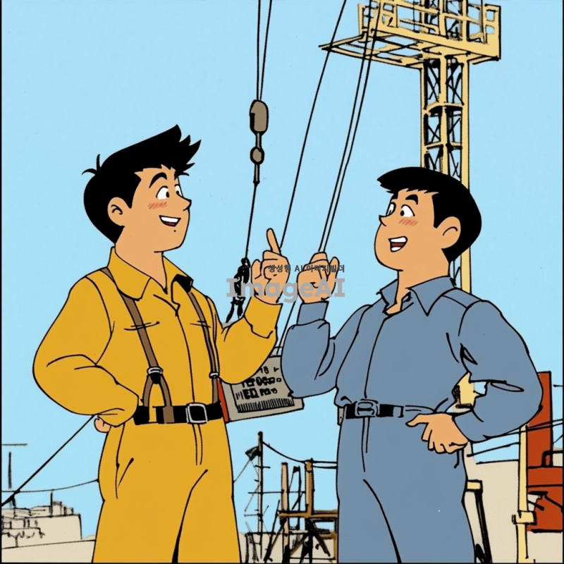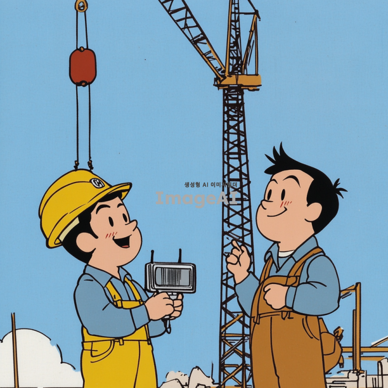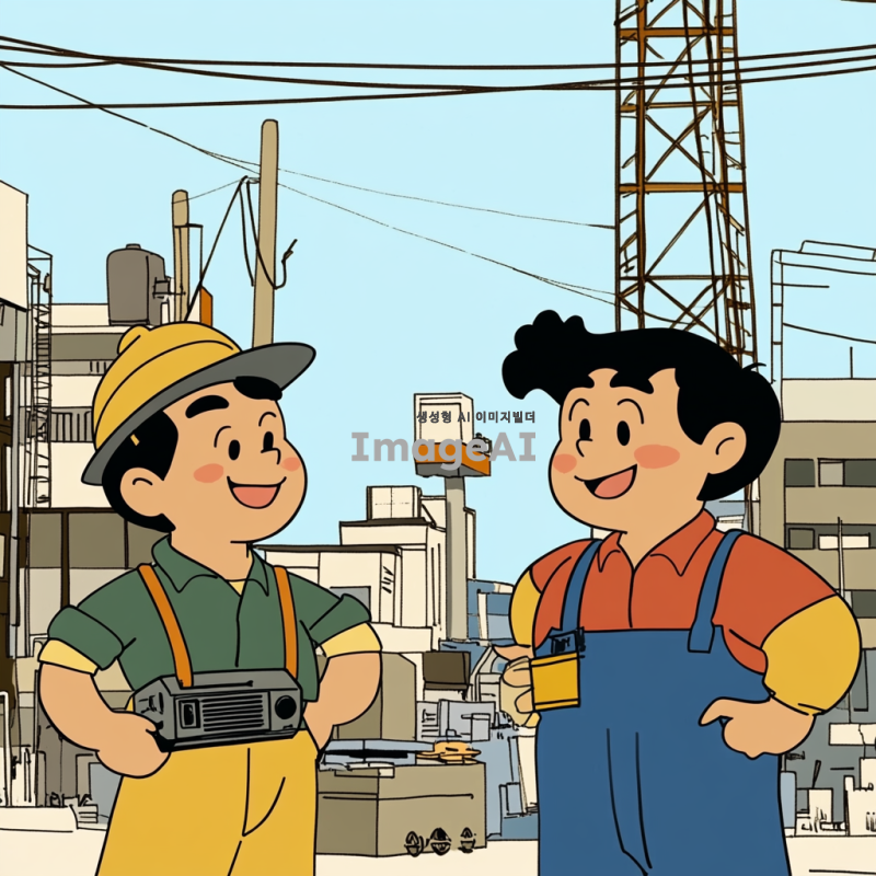 노가다 현장에서 일하는 한국인 남성 두명이 서로 이야기를 나누며 라디오를 듣고 있는 모습. 배경은 건설 현장으로, 햇빛이 비치는 밝은 날씨. 남성들은 작업복을 입고 있으며, 서로 웃으며 소통하고 있는 장면을 포착. 라디오에서 나오는 음악의 느낌이 전해질 수 있도록 즐거운 분위기를 강조. 일러스트 형식으로 제작