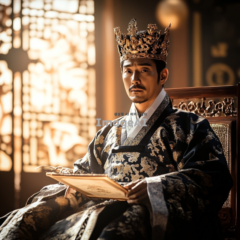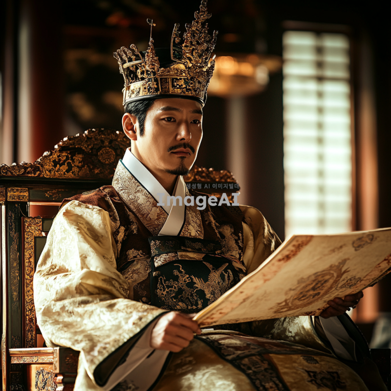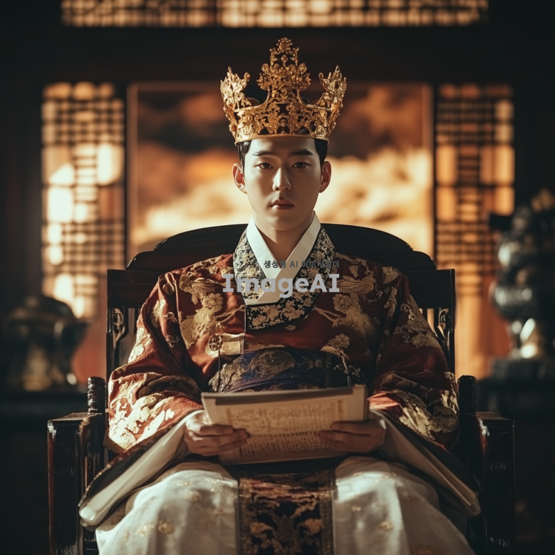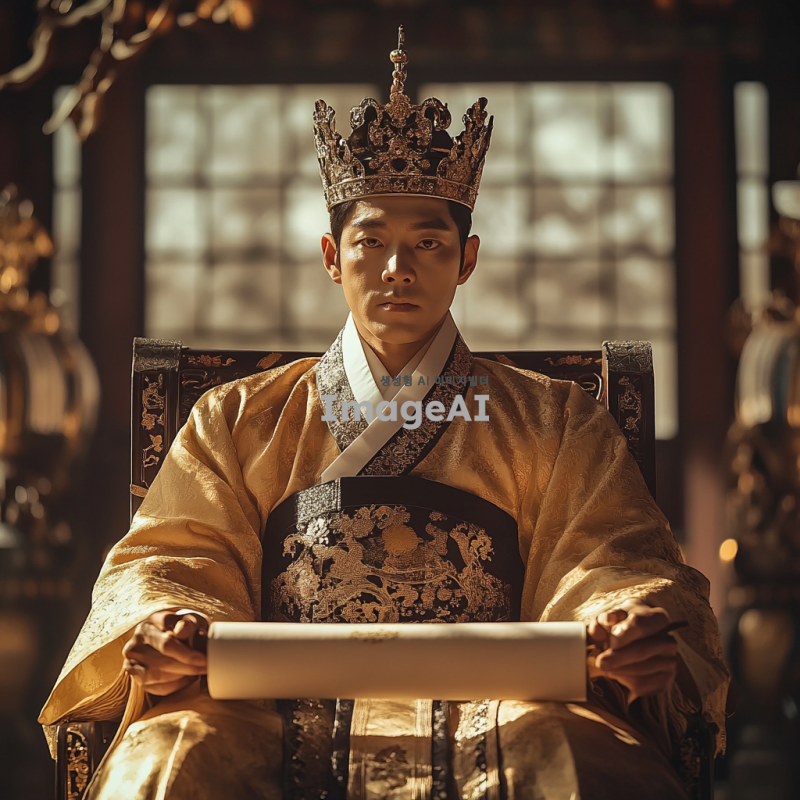 조선의 왕이 궁궐에서 의자에 앉아 있는 모습, 전통적인 한복을 입고 있으며 금색 장식이 돋보이는 왕관을 쓰고 있음. 궁궐의 화려한 배경이 보이고, 주변에는 조선시대의 전통 문양과 장식들이 어우러져 있음. 왕의 표정은 위엄 있고 침착하며, 손에는 고전적인 두루마리를 들고 있음. 자연광이 들어오는 창문을 통해 따뜻한 빛이 비치고, 전체적으로 고풍스러운 느낌을 주는 이미지.