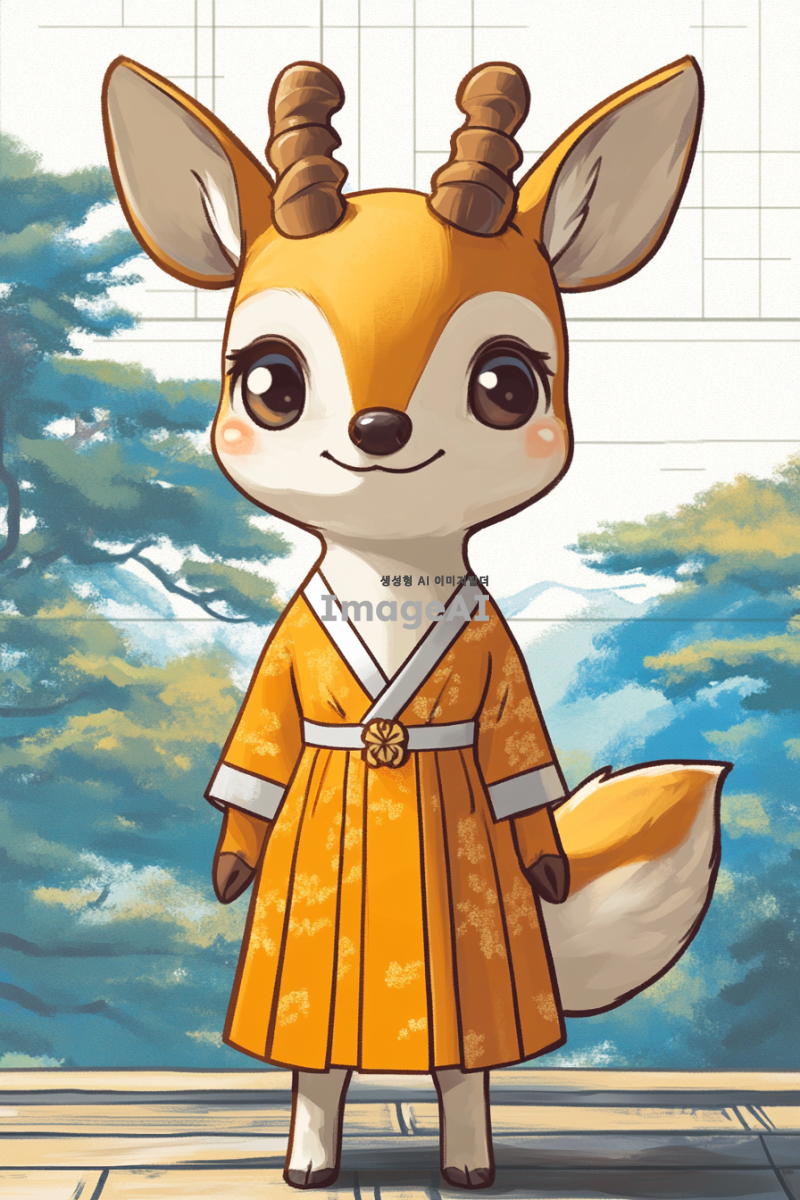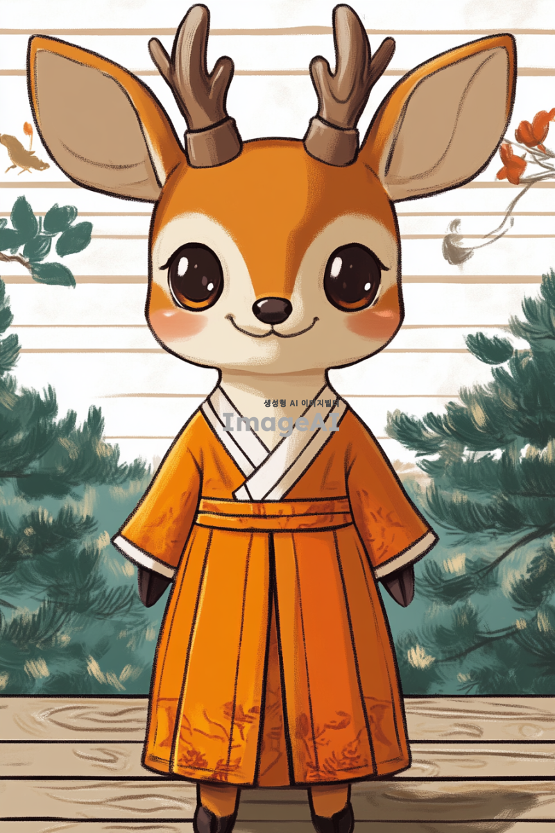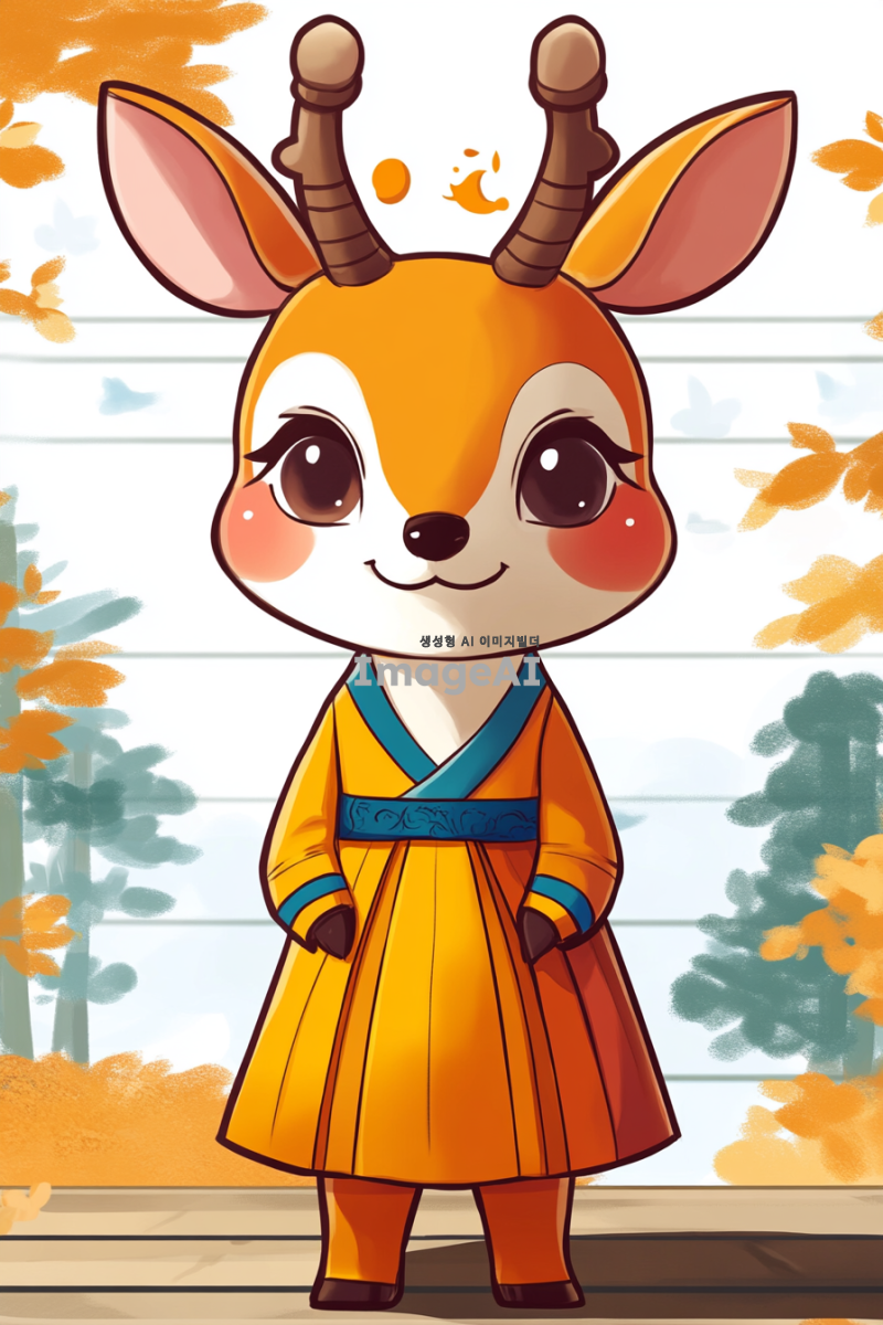 한복을 입고 있는 귀여운 사슴 캐릭터, 전통적인 한국의 아름다움을 강조한 디자인, 화사한 색상의 한복과 우아한 포즈, 배경에는 한국의 전통적인 풍경이 어우러진 모습, 아기자기하고 사랑스러운 분위기
