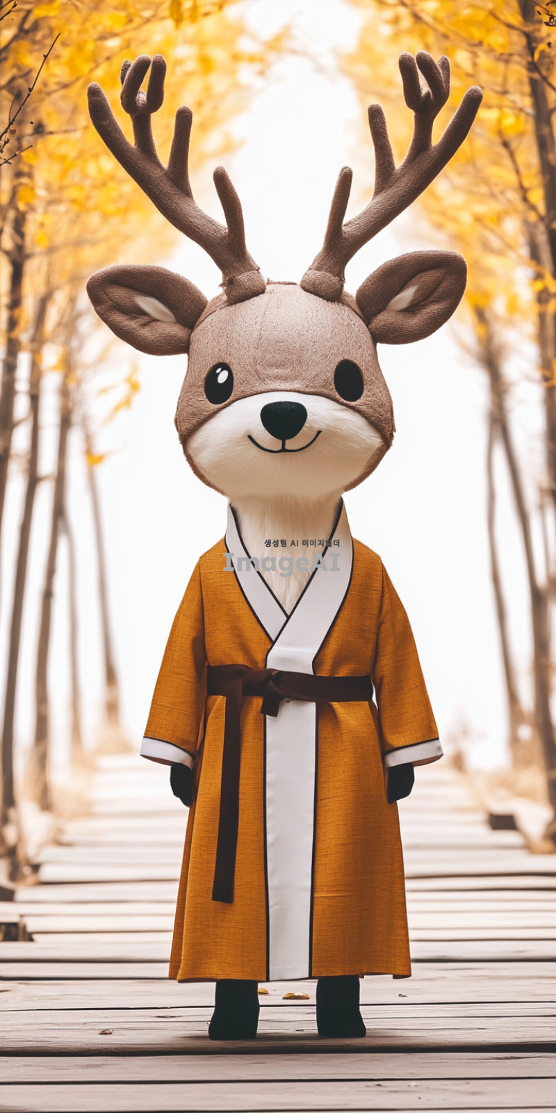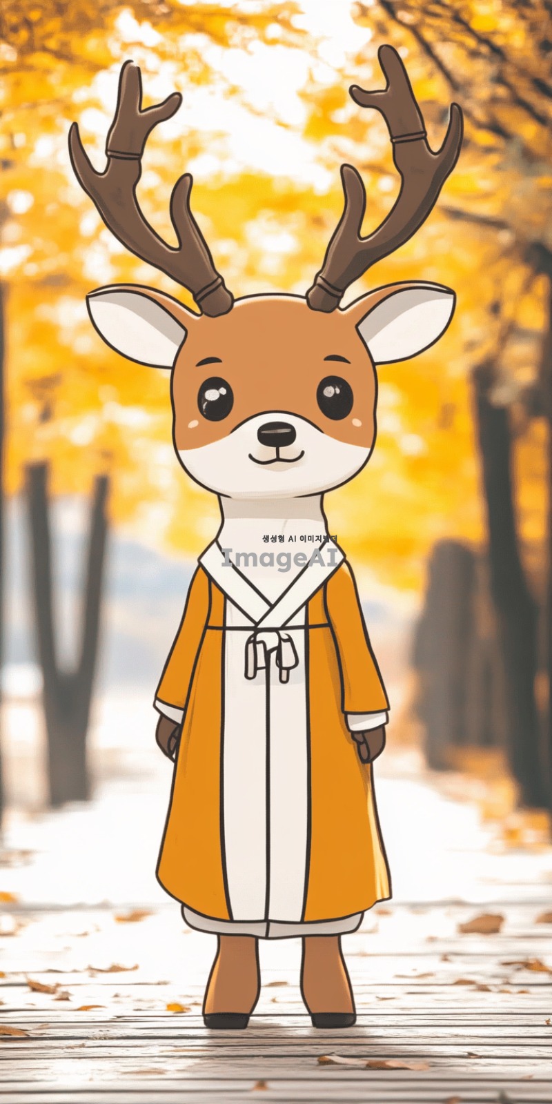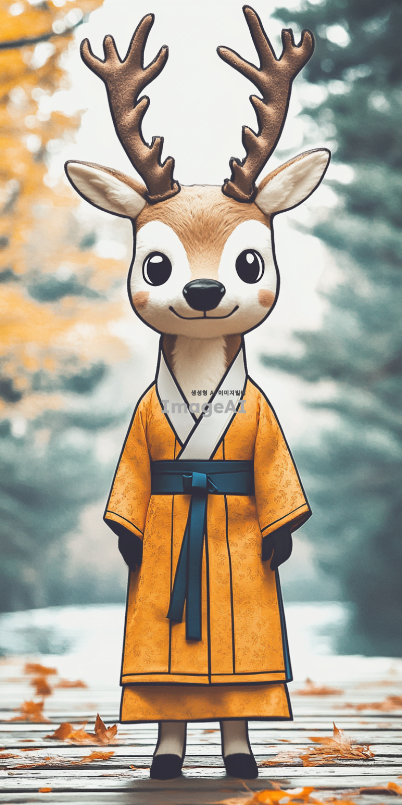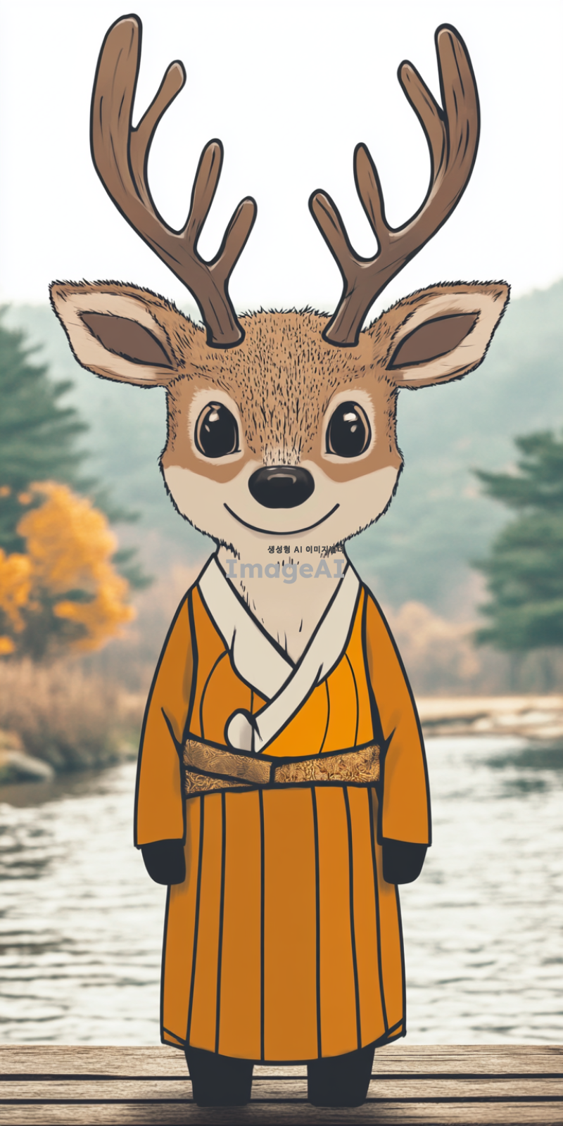 조선의 전통 복장을 입고 있는 사슴 캐릭터 , 남자 한복을 입고 있는 모습, 아름다운 뱃길에서 우아하게 서 있는, 전통적인 한국의 미를 강조한 이미지