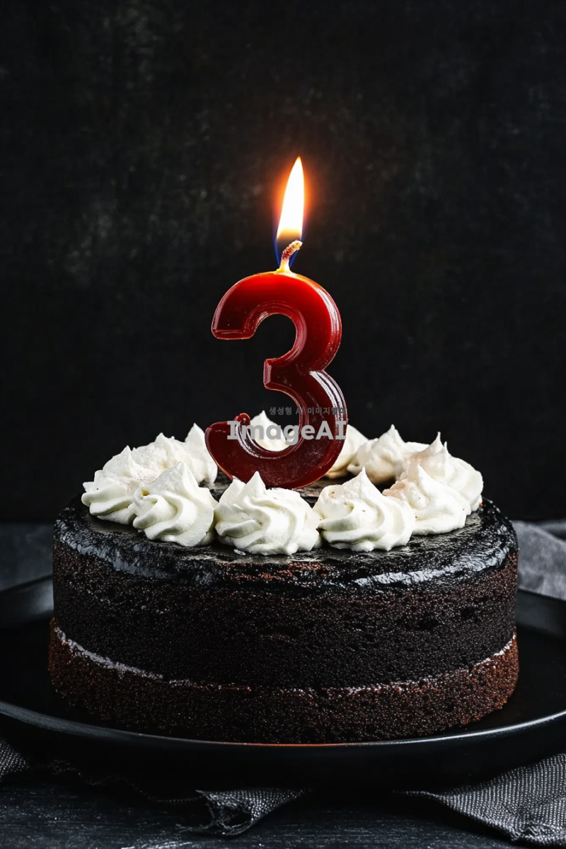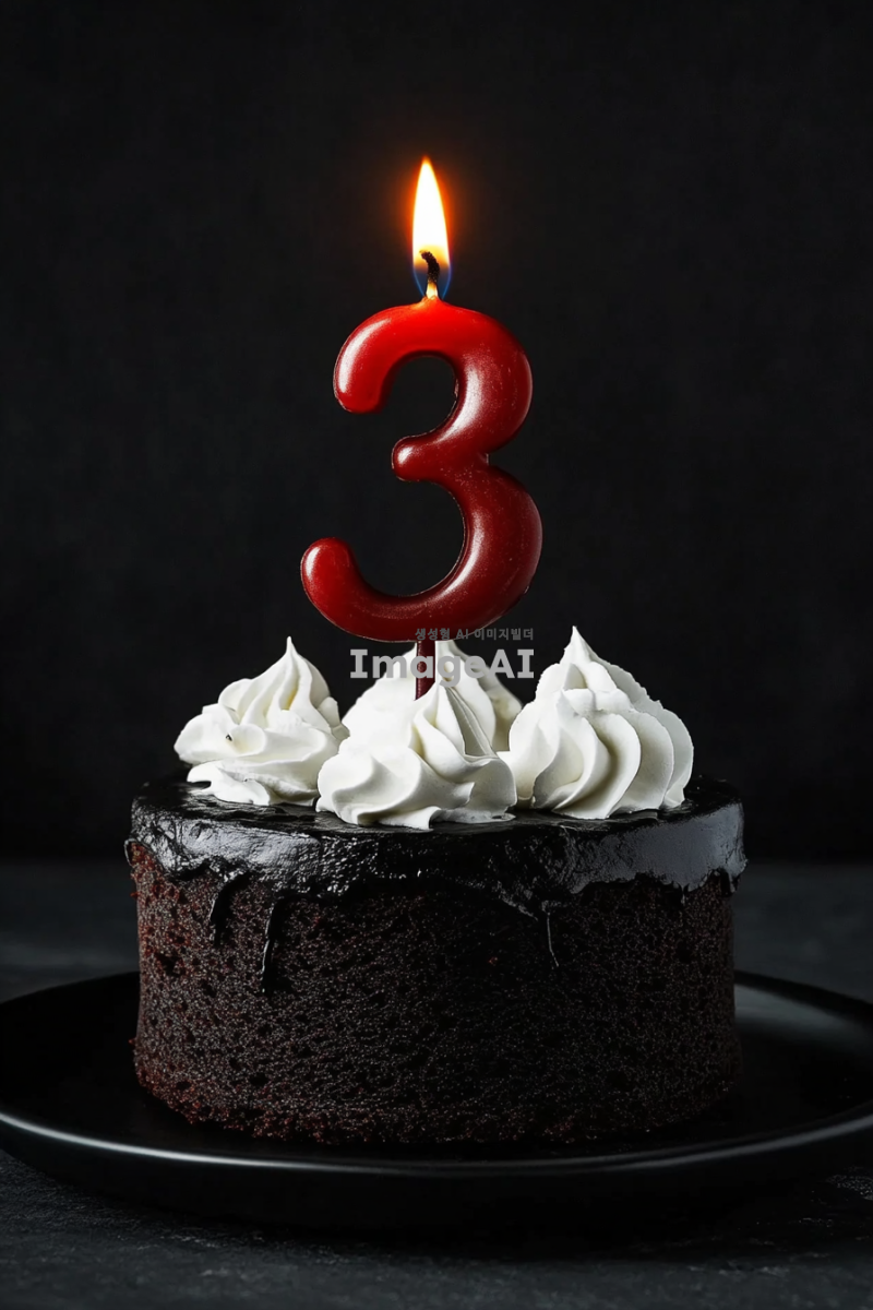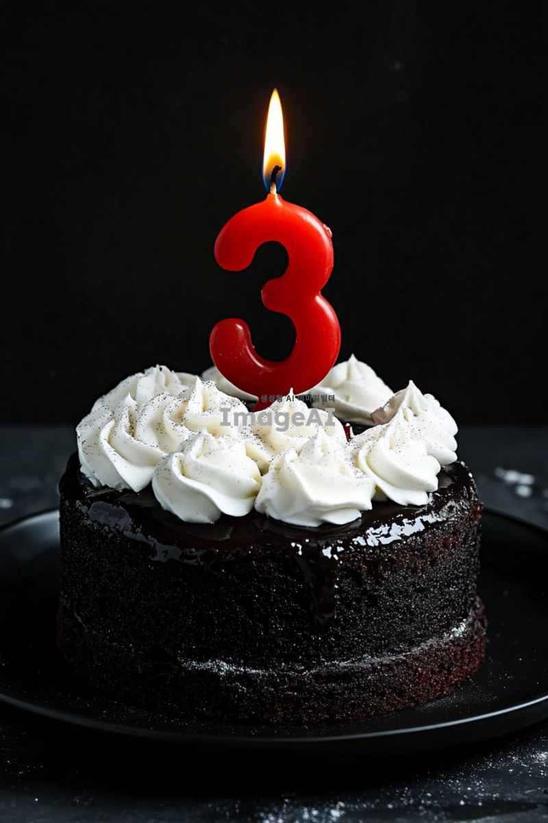검은 배경 위에 놓인 검은색 케이크, 케이크 위에는 흰색 생크림으로 장식, 숫자 3이라는 불붙은 초가 배치되어 있는 모습. 케이크는 검은색 접시에 담겨 있으며, 전체적으로 심플하고 세련된 느낌을 주는 이미지.