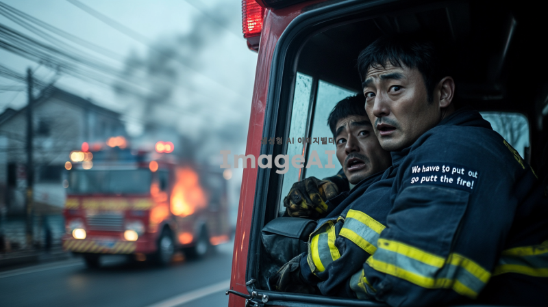 두 명의 한국인 소방수가 소방차에 탑승해 있는 모습. 운전석에 앉아 있는 소방수는 창밖으로 원수의 집이 불타는 장면을 바라보며 고민하는 표정을 짓고 있다. 옆에 앉은 동료 소방수는 그의 멱살을 잡고 절박한 표정으로 "불을 끄러 가야 해!"라고 소리치는 모습. 소방차는 긴급 상황을 반영하듯 경고등이 켜져 있고, 배경에는 타오르는 불꽃과 연기가 피어오르는 집이 보인다. 긴박한 상황 속에서의 갈등과 결단의 순간을 담아낸 장면.