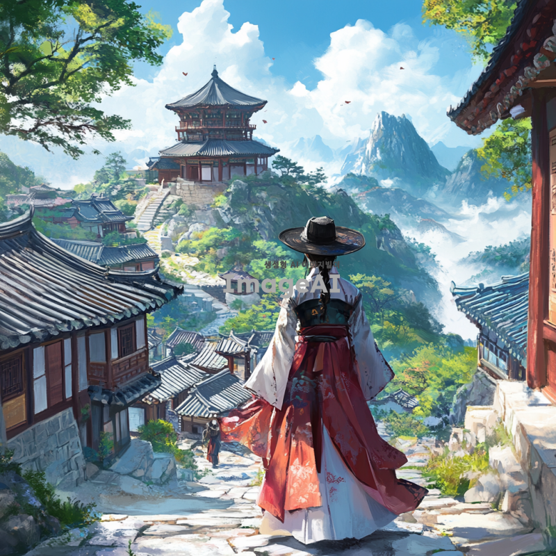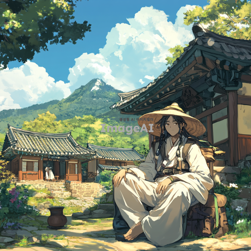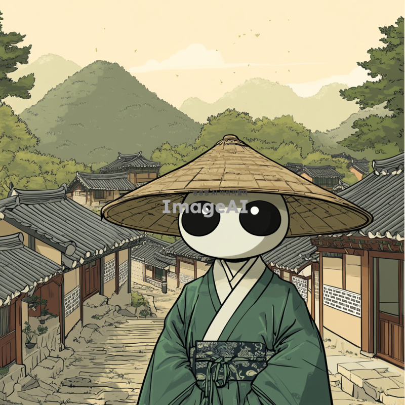 초가스 캐릭터를 한국 전통 의상을 입고 있는 모습으로 그려주세요. 배경은 한국의 전통 마을 풍경으로, 고즈넉한 한옥과 아름다운 자연이 어우러진 장면을 담아주세요. 초가스의 특징적인 외형을 살리면서도 한국적인 요소를 강조해 주세요.