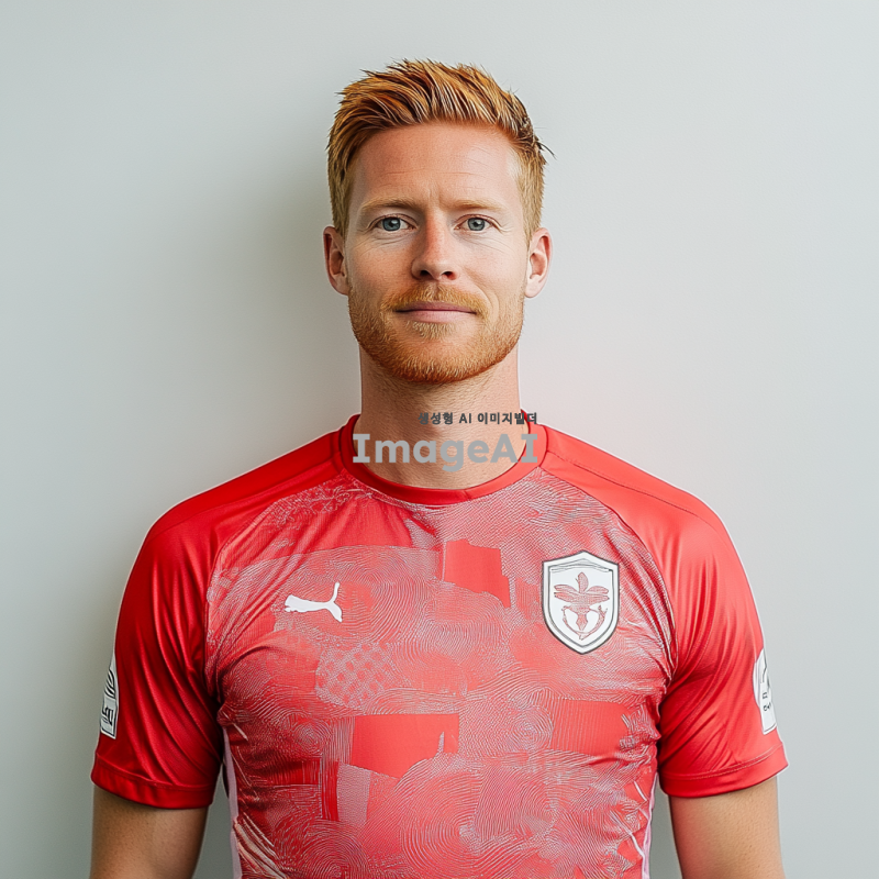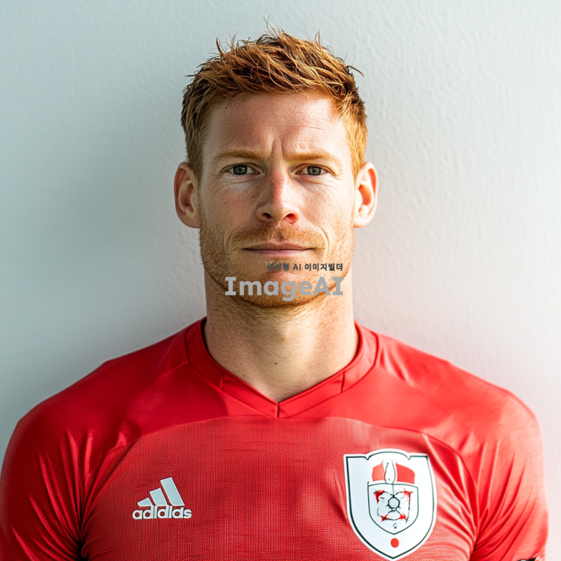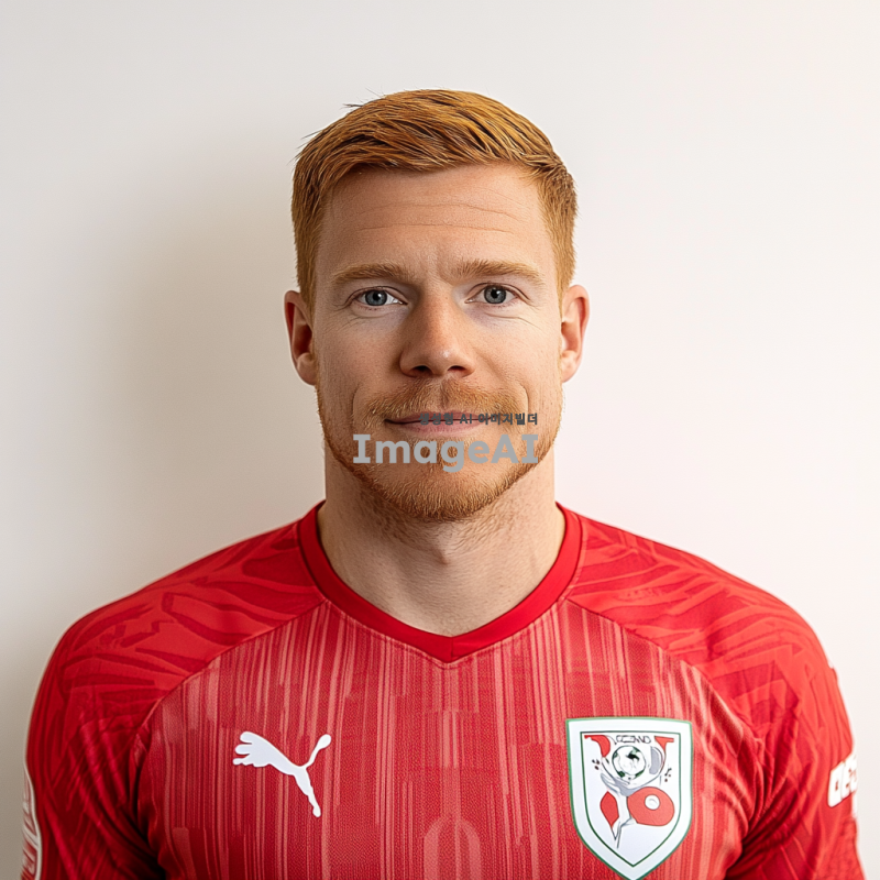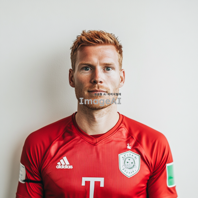 덴마크 국적의 축구선수, 든든한 체격의 골키퍼, 진저색의 짧은 머리, 덴마크 국가대표팀 골키퍼 유니폼을 입고 있는 모습, 흰색 벽을 배경으로 한 오피셜 정면사진.