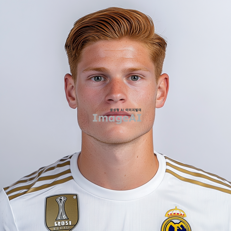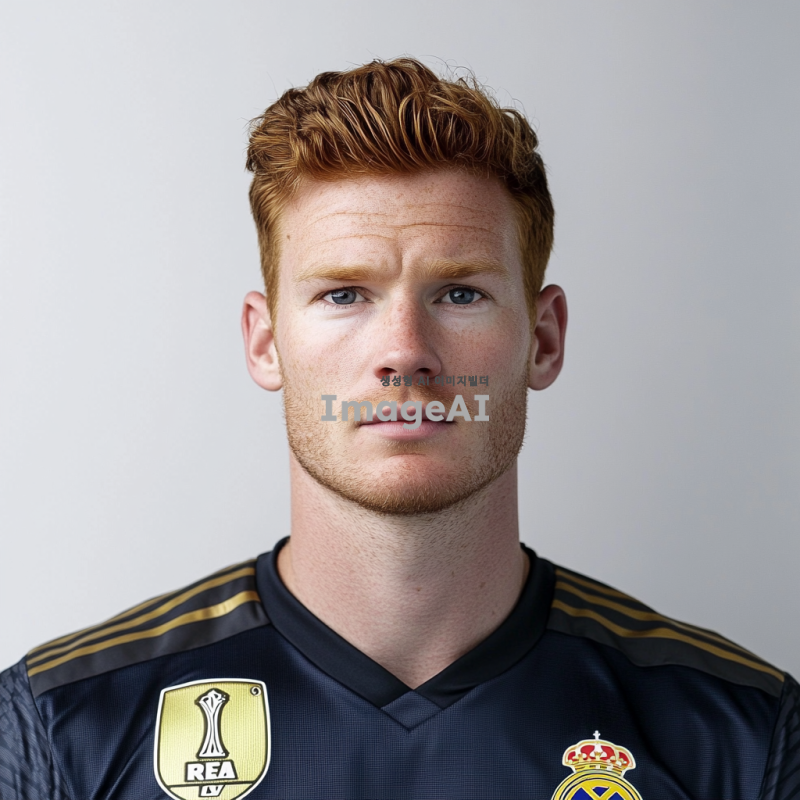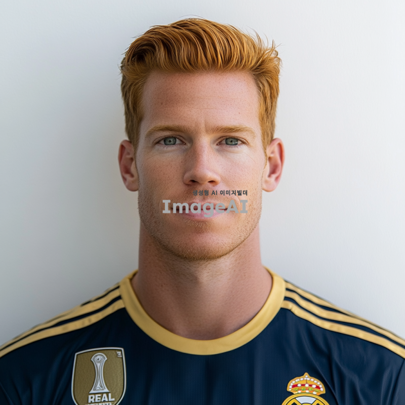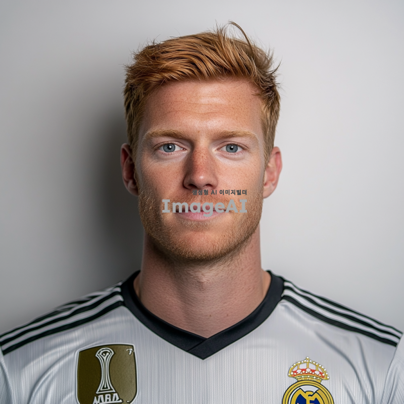 덴마크 국적의 축구선수 유망주, 키 크고 날렵한 체격의 골키퍼, 진저색의 머리, 수염없이 깔끔한 턱, 레알마드리드 골키퍼 유니폼, 흰 색 벽 배경의 오피셜 정면사진