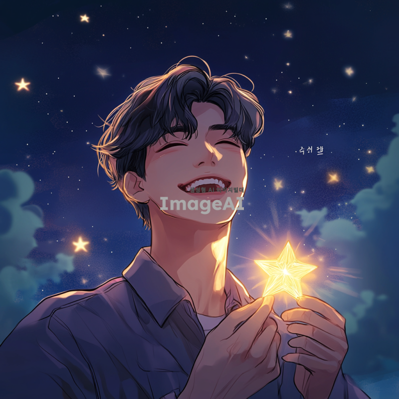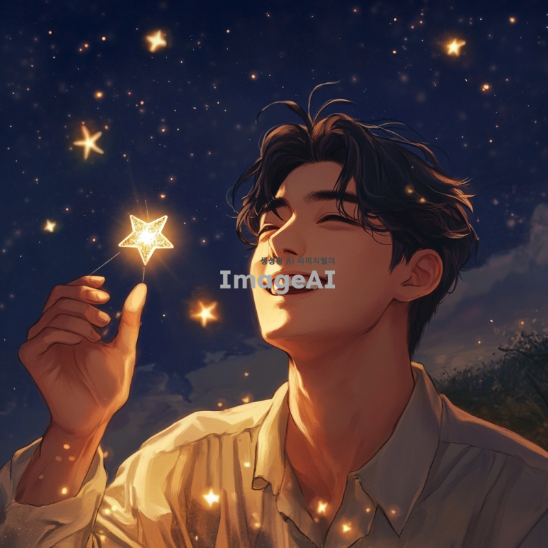 반짝이는 별들이 가득한 밤하늘 아래, 행복한 표정을 짓고 있는 한국인 남성이 손에 별을 쥐고 있는 모습. 따뜻한 미소와 함께 주변에 은은한 빛이 퍼져나가고, 별빛이 그의 얼굴을 환하게 비추고 있는 장면. 배경은 고요한 자연 풍경으로, 별들이 반짝이며 꿈꾸는 듯한 분위기를 자아내고 있는 이미지.