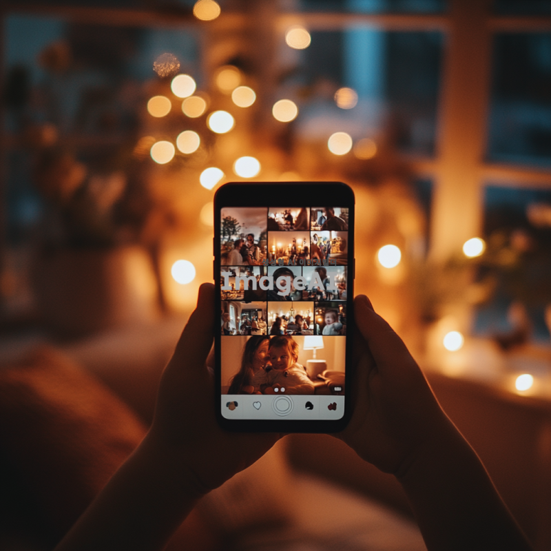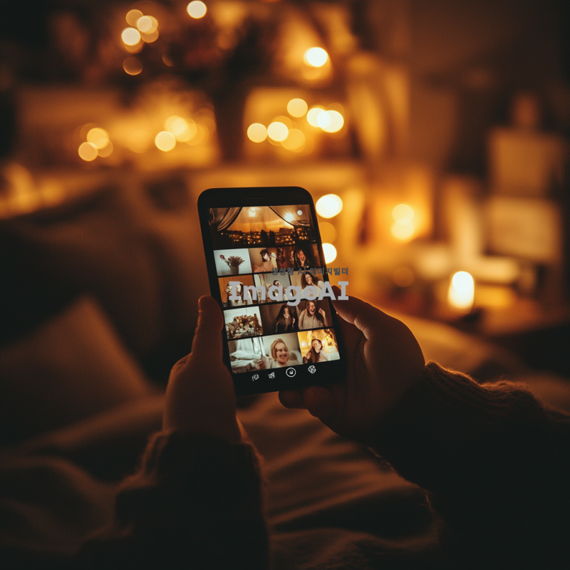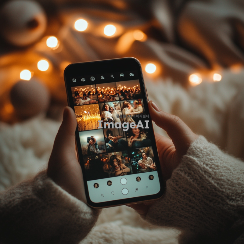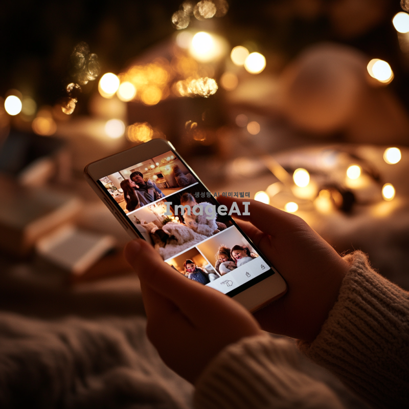 작은 손에 쥐어진 휴대폰, 화면에는 다양한 사진과 영상들이 가득 차 있어, 행복한 순간들이 담겨 있는 모습, 주변은 따뜻한 조명으로 아늑한 분위기를 연출하고, 배경에는 소중한 기억을 떠올리게 하는 소품들이 놓여 있는 장면.